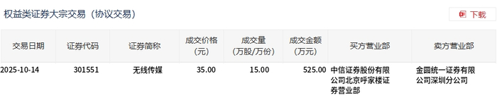 | 权益类证券大宗交易(协议交易) | | | | | | 团 下载 | | --- | --- | --- | --- | --- | --- | --- | | 交易日期 | 证券代码 | 证券简称 | 成交价格 (元) | 成交量 (万股/万份) | 成交金额 买方营业部 (万元) | 卖方营业部 | | 2025-10-14 | 301551 | 无线传媒 | 35.00 | 15.00 | 525.00 中信证券股份有限 公司北京呼家楼证 劳营业部 | 金圆统一证券有限 公司深圳分公司 | 10月14日,无线传媒大宗交易成交15万股,成交额525万元,占当日总成交额的2.24%,成交价35元, 较市场收盘价35.24元折价0.68%。 ...