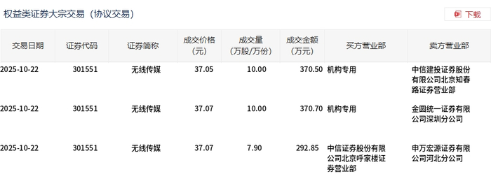 | 权益类证券大宗交易(协议交易) | | | | | | 团 下载 | | --- | --- | --- | --- | --- | --- | --- | | 交易日期 | 证券代码 | 证券简称 | 成交价格 (元) | 成交量 (万股/万份) | 成交全额 买方营业部 (万元) | 卖方营业部 | | 2025-10-22 | 301551 | 无线传媒 | 37.05 | 10.00 | 370.50 机构专用 | 中信建投证券股份 | | | | | | | | 有限公司北京知春 | | | | | | | | 路正券营业部 | | 2025-10-22 | 301551 | 无线传媒 | 37.07 | 10.00 | 370.70 机构专用 | 金圆统一证券有限 | | | | | | | | 公司深圳分公司 | | 2025-10-22 | 301551 | 无线传媒 | 37.07 | 7.90 | 292.85 中信证券股份有限 | 申万宏源证券有限 | | | | | | | 公司北京呼家楼证 444 22 . 11. 40 | 公司河北分公司 | 10月22日,无线传媒大宗交易成交 ...