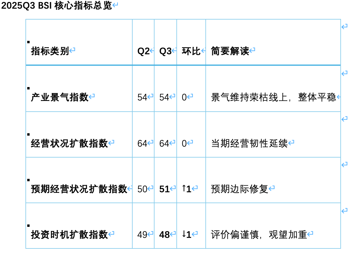 三季度中国经济与企业表现核心画像 - 整体经济呈现“现实可守、预期微升、投资评价趋谨”的特征,但生产与库存链条启动“备货式修复”[1] - 企业经营状况扩散指数为64,与上季持平,显示当期经营韧性延续[1][3] - 预期经营状况扩散指数升至51,较上季提升1点,重新回到荣枯线之上,显示预期边际修复[1][3] - 投资时机扩散指数回落至48,较上季下降1点,反映企业投资评价趋于谨慎[1][3] 关键指标表现 - 生产量扩散指数明显回升至51,较上季的46提升5点,显示生产活动从“谨慎增产”转向“实质修复”[4][5] - 成品库存扩散指数边际上升至49,较上季的45提升4点,补库行为延续且备货属性增强[4][5] - 价格扩散指数弱回升至48,较上季的47轻微抬升1点,量价关系处于温和修复状态[4][6] - 单位成本和原材料成本扩散指数均升至62,较上季的59和60分别提升3点和2点,劳动力成本指数升至50,成本压力持续抬升[4][6] 投资与融资环境 - 有固定资产投资的企业比例从10.3%升至11.3%,扩张型投资(>3%资产)的企业比例从7.2%升至8.9%,显示投资行为边际抬头[4][6] - 银行借贷态度扩散指数为94,虽较上季的100边际回落,但仍处于偏宽松区间[4][6] - 新增贷款企业比例维持在2.8%的低位横盘,“宽货币、弱信用”的格局未根本改观[4][6] 外部环境与市场表现 - 三季度上证指数上涨12.73%,从3445点升至3882点,创近十年新高区间,显著修复了市场情绪与风险偏好[1][5] - 企业对中美贸易战的直接冲击感钝化,77.6%的受访企业认为“无影响”,认为有负面影响的企业占22.0%[11] - 对于影响幅度,72.9%的企业认为影响“小”,16.5%认为“中”,10.6%认为“大”[11] 四季度展望与关键驱动 - 外部环境出现“攻守之势微转”,中美经贸磋商取得初步共识,市场对外需不确定性的定价开始下行[2][12] - 美联储“降息+止缩表”的组合预计将改善全球流动性,推动“弱信用”向“温和信用”过渡,有利于企业融资环境[12][13] - “十五五”规划建议强调科技自立自强、传统产业高端化改造与扩大内需,为企业中长期投资提供清晰的政策锚点[2][13] - 四季度基调被概括为“结构性起跑”,企业接单逻辑可能从“回避”转向“挑选”,投资重点从“规模扩张”转向“质量扩张”[13]