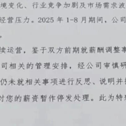 以下文章来源于三言Pro ,作者DorAemon 三言Pro . 聚焦新未来新科技,严肃又活泼 "匹克降薪"风波再次升级。 有员工晒出一份盖有公司公章的通知,内容为: 受行业竞争加剧及市场需求波动等多重因素影响,公司持续面临经营压力。2025年1-8月期间,公司直营销售体系持续亏损,未见好转。 为保障公司持续运营,鉴于双方前期就薪酬调整事宜尚未达成一致且由于您不服从公司相关的管理安排,经公司审慎研究决定:如截至2025年10月14日仍未就相关 事项进行反思、说明并提交检讨,公司将自2025年9月起对您的薪资暂作停发处理。此为特殊时期的临时性措施。 公司将持续关注经营改善进展,也将积极推动直营销售体系的改革,力求逐步扭转当前局面。我们诚挚欢迎并鼓励所有认同公司发展理念、愿与公司共渡难关的员 工积极参与改革进程。 在此特殊时期,请您继续遵守公司规章制度,正常履行岗位职责。如出现旷工、怠工等违纪行为,公司将按相关规定处理。" 简而言之,即匹克要求拒绝降薪的员工需要在10月14日前提交"反思检讨",否则将自9月起停发工资。 而此前提交"拒绝降薪"文件的员工被视为不服从管理,薪资也会受影响。 今年9月,多名匹克员工爆料 ...