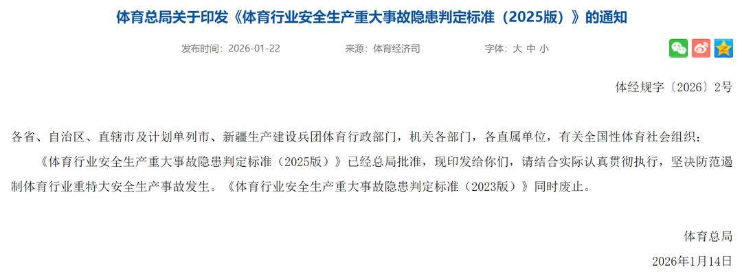 此外,《2025版标准》还明确跨行业隐患归口原则,对消防、燃气、特种设备等已有国家规定的,严格"从其规定",确保政策执行连贯统一。 2026年1月,5名人员刻意避开管护站,违规进入国家明令禁止穿越的"鳌太线"高危区域,最终造成3人遇难。该事件暴露出违规行业发展过程中暴露出的 突出问题,而这些正是《2025版标准》重点规制的内容。比如,此次新规中就明确将"应批准赛事未履行审批程序""高危活动未开展安全风险评估"列为重 大事故隐患,从制度层面堵住类似监管漏洞。 业内人士告诉记者,《2025版标准》的发布实施,是对近年来体育行业安全事故教训的系统回应。近些年来,随着中国体育发展不断加速,有越来越多人 在日常关注参与到各类体育活动当中,但出现过的相关安全事件则反映出赛事审批不严、责任落实不力、风险防控薄弱等共性问题。"新政策通过细化判 定标准、明确责任主体、强化全流程管控,为体育行政部门执法监管提供了统一标尺,也为行业主体自查自纠划定了清晰边界。"该业内人士说。 可以肯定的是,随着《2025版标准》的落地,将有效防范化解体育行业重大安全风险,为全民健身事业和体育产业高质量发展筑牢安全根基。 1月22日,国家体育总局正 ...