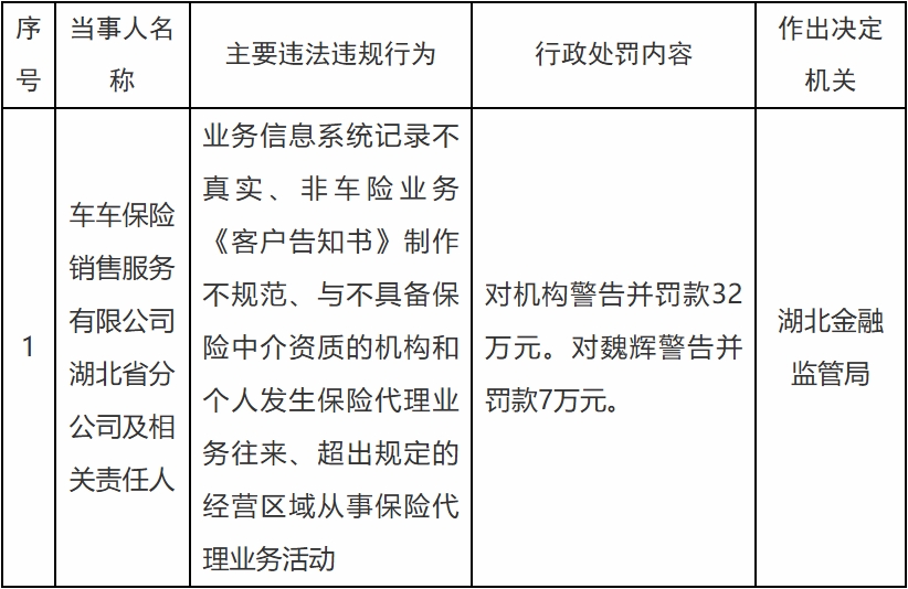 监管处罚事件 - 国家金融监督管理总局湖北监管局对车车保险销售服务有限公司湖北省分公司及相关责任人作出行政处罚 [1] - 处罚原因为业务信息系统记录不真实、非车险业务《客户告知书》制作不规范、与不具备保险中介资质的机构和个人发生保险代理业务往来、超出规定的经营区域从事保险代理业务活动 [1] - 对机构处以警告并罚款32万元人民币,对责任人魏辉处以警告并罚款7万元人民币 [1]