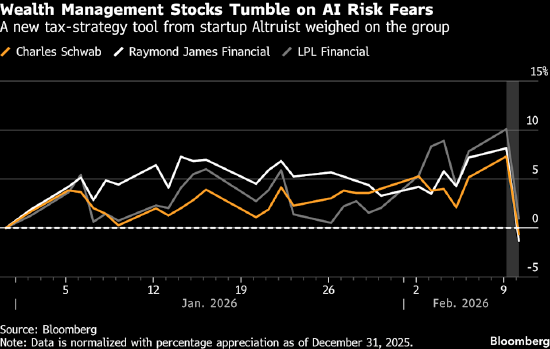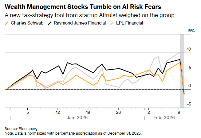AI颠覆恐慌引发市场剧变 - 华尔街投资逻辑发生剧变 投资者从热衷寻找AI赢家转向急于抛售可能被AI颠覆的公司股票 恐慌情绪从软件行业蔓延至金融服务、财富管理、保险经纪和法律服务等多个领域 引发剧烈抛售 [1] - 市场情绪已从担忧AI泡沫转向恐惧整个经济板块被颠覆 呈现出“先卖出、再提问”的恐慌特征 [1] 财富管理行业成为最新重灾区 - 初创公司Altruist Corp推出的AI税务策略工具Hazel 导致嘉信理财、Raymond James Financial Inc和LPL Financial Holdings Inc等财富管理公司股价单日暴跌7%以上 这是这些股票自4月以来的最大跌幅 [1] - Hazel工具能够帮助财务顾问为客户定制个性化策略 而这项工作通常需要整个团队来完成 该工具每月仅需100美元 [2] - 此次抛售抹去了多家投资公司数十亿美元的市值 其CEO认为这发出了强烈信号 表明其公司构成了竞争威胁 [2] 恐慌情绪在多个行业快速蔓延 - 上周Anthropic推出的新工具引发了软件、金融服务、资产管理和法律服务板块的深度回调 标志着市场情绪的转折点 [1][2] - 在线保险市场Insurify推出使用ChatGPT比较汽车保险费率的新应用后 美国保险经纪商股价遭受重创 投资者逻辑是任何可能被AI取代的中介服务都面临生存威胁 [1][3] - OpenAI和Anthropic等AI公司已在软件工程领域取得进展 并正在向其他行业扩张 [3] 市场对颠覆速度与范围存在分歧 - 部分市场人士对AI颠覆的速度和范围持怀疑态度 认为技术颠覆往往需要比预期更长的时间才能实现 [4] - 有观点指出银行业曾周期性面临来自加密货币等技术的挑战 但最终都未能撼动其主导地位 [4] - 有分析师认为当前市场对AI输家的焦虑为时过早 市场试图对此做出判断 但仍处于初期阶段 [4][5] 高估值加剧市场敏感性 - 在AI支出热潮和经济韧性推动下 股市大幅上涨 估值被推高 使投资者对任何负面信号都极为敏感 [5] - 分析师指出 如果市场察觉到任何略微负面的信息 股票就会下跌10% 这种情况在估值不是这么高的市场中不会发生 [5] - 高度紧张的市场环境意味着 即使是小型初创公司推出的产品 也可能引发大型上市公司的剧烈波动 投资者“宁愿错杀”的心态正在重塑华尔街投资策略 [5]