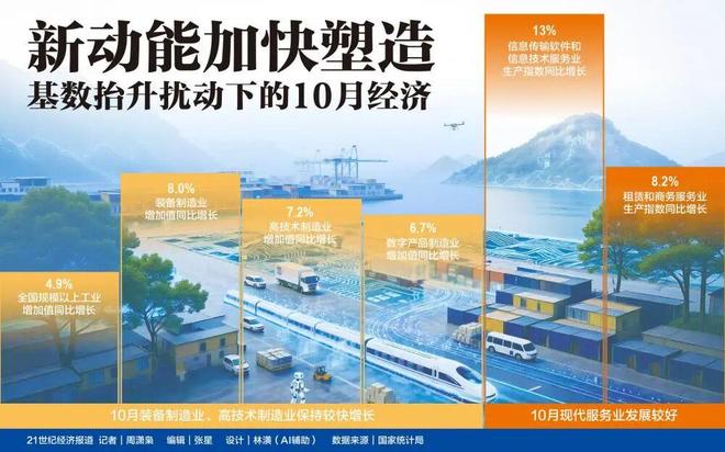市场需求焕新提升 - 消费新业态、新模式、新场景不断拓展,数字、绿色、智能产品消费快速壮大,服务消费稳步扩大 [1] - 1—10月份实物商品网上零售额占社会消费品零售总额比重达25.2%,较1-9月份提高0.2个百分点 [1] - 高能效等级家电、新能源汽车零售额保持较快增长,智能家电、智能家居等产品需求扩大,文体休闲服务类、旅游咨询租赁服务类零售额均保持两位数增长 [1] - 高技术领域投资较快增长,新能源、新材料、人工智能等领域投资扩大,1—10月份航空、航天器及设备制造业投资同比增长19.7%,信息服务业投资增长32.7% [1] - 机电产品和高技术产品出口扩大,1—10月份机电产品出口额占全部出口额比重达60.7% [1] 产业升级态势 - 制造业向中高端稳步迈进,装备制造业支撑作用明显,1—10月份规模以上装备制造业增加值同比增长9.5%,占规模以上工业比重达36.1%,对工业增加值增长贡献率达58.7% [2] - 服务业与先进制造业深度融合,现代服务业发展势头良好,前三季度信息传输软件和信息技术服务业、租赁和商务服务业增加值合计占第三产业比重达16.3%,同比提高0.8个百分点 [2] 新兴产业发展壮大 - 数字经济快速发展,绿色低碳转型持续深入,人工智能赋能产业发展,数字制造、智能制造等行业成长壮大 [2] - 1—10月份规模以上数字产业制造业增加值同比增长9.5%,智能设备制造、电子元器件及设备制造行业增加值分别增长11.1%和12.3% [2] - 新能源、新材料、航空航天、低空经济等发展潜力巨大,量子科技、生物制造、具身智能等前景广阔,有望成为新兴支柱产业 [2] 经济结构调整与动能转换 - 经济由高速增长转向高质量发展,呈现增速换挡、结构优化、动能转换特征 [1] - 在传统产业增势减缓背景下,数字经济、平台经济等新需求扩大,新兴产业快速发展,产业升级势头明显 [1] - 经济结构调整稳步推进,新旧动能转换存在阵痛,但新质生产力培育成长、新能源持续壮大、经济高质量发展趋势向好 [3]