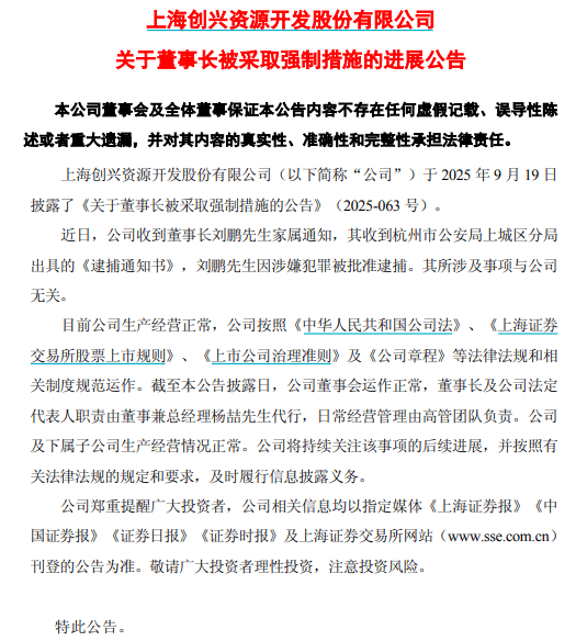 10月30日晚,*ST创兴公告,公司近日收到董事长刘鹏家属通知,其收到杭州市公安局上城区分局出具 的《逮捕通知书》,刘鹏因涉嫌犯罪被批准逮捕。其所涉及事项与公司无关。 *ST创兴表示,截至本公告披露日,公司董事会运作正常,董事长及公司法定代表人职责由董事兼总经 理杨喆代行,日常经营管理由高管团队负责。公司及下属子公司生产经营情况正常。 据公开报道,刘鹏曾长期任职于*ST创兴前实际控制人余增云旗下"华侨系"企业。 2024年9月,*ST创兴公告前实控人余增云失联,公司股价闪崩。随后,余增云名下华侨基金出现兑付 危机。2024年11月,*ST创兴进一步公告称,余增云因涉嫌集资诈骗,被杭州市公安局上城区分局认为 符合刑事立案标准,已被立案调查。 此次逮捕刘鹏的杭州市公安局上城区分局也是余增云相关案件的经办单位。 公开资料显示,上海创兴资源开发股份有限公司于1999年5月27日上市,公司的主营业务是建筑工程业 务等其他建筑业、移动信息服务业务和算力服务业务。 来源:证券时报、第一财经、每日经济新闻 编辑:薛锦瑜、刘嘉泳 资料显示,刘鹏,1980年6月出生,汉族,中国国籍,毕业于浙江大学管理学院,硕士研究生学历。刘 鹏 ...