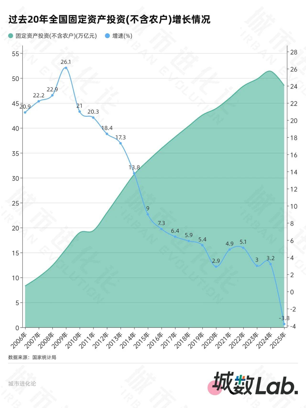 全国固定资产投资整体趋势 - 过去20年,全国固定资产投资(不含农户)规模从2004年的7.3万亿元增长至2024年的55万亿元[1][2] - 2025年,全国固定资产投资(不含农户)出现罕见收缩,但具体下降幅度未在文中明确给出[11] - 若扣除大幅下降的房地产开发投资,2025年全国固定资产投资降幅将收窄至0.5%[11] 房地产开发投资情况 - 过去20年,全国房地产开发投资增速波动较大,最高曾达31.2%,2025年则大幅下降17.2%[3][4][11] - 2025年,全国31个省份的房地产投资增速普遍为负,其中吉林(-25.6%)、安徽(-24.5%)、海南(-23%)、广东(-23.6%)、江苏(-21.6%)等省份降幅超过20%[5] - 房地产投资的大幅负增长是导致2025年全国固定资产投资整体下跌的核心原因[11] 分地区固定资产投资增速 - 2025年,全国共有18个省份的固定资产投资增速“跑赢”全国水平,西藏以17.2%的增速高居全国第一,新疆、河北、宁夏、北京位列全国前五[11] - 同期,有7个省份固定资产投资出现两位数降幅,东北三省均在列[11] - 按地区划分,2025年东北地区投资负增长15.5%,降幅最大;东部、中部、西部地区投资分别下降8.4%、2.7%、1.3%[11] - 与2024年相比,多数省份2025年投资增速显著下滑,例如浙江从0.4%降至-9.2%,安徽从4.7%降至-10.3%[7][8] 高技术产业与设备更新投资 - 2025年,部分高技术产业投资保持快速增长,其中信息服务业投资增长28.4%,航空、航天器及设备制造业投资增长16.9%[11] - 在大规模设备更新政策带动下,2025年全国设备工器具购置投资增长11.8%,拉动整体投资增长1.8个百分点[11] - 2025年,全国共有24个省份的设备工器具购置投资实现正增长,其中北京(45.5%)、上海(45%)、河北(43.2%)、内蒙古(34.7%)、重庆(21.3%)等15个省份增速突破两位数[5][12] 基础设施投资与其他领域 - 2025年,全国基础设施投资出现2.2%的下降[11] - 房地产投资、基建投资与高技术制造投资之间的此消彼长与增速边际走低,是近年来新旧动能转换的核心表现[11] - 2025年投资增速下降被视为经济新旧动能转换过程中的阶段性现象[11] 政策导向与未来展望 - 2025年底的中央经济工作会议已将“推动投资止跌回稳”纳入2026年重点任务,计划适当增加中央预算内投资规模,优化地方政府专项债券用途管理,并激发民间投资活力[12] - 为冲刺“开门红”,北京、上海、湖南等多地已计划在一季度密集开工重大项目并加大投资力度[12] - 各地在稳住传统投资基本盘的同时,正积极优化投资结构,进一步聚焦科创载体、设备更新、新型基础设施等领域布局项目,旨在从供给侧重塑经济增长动力[12]