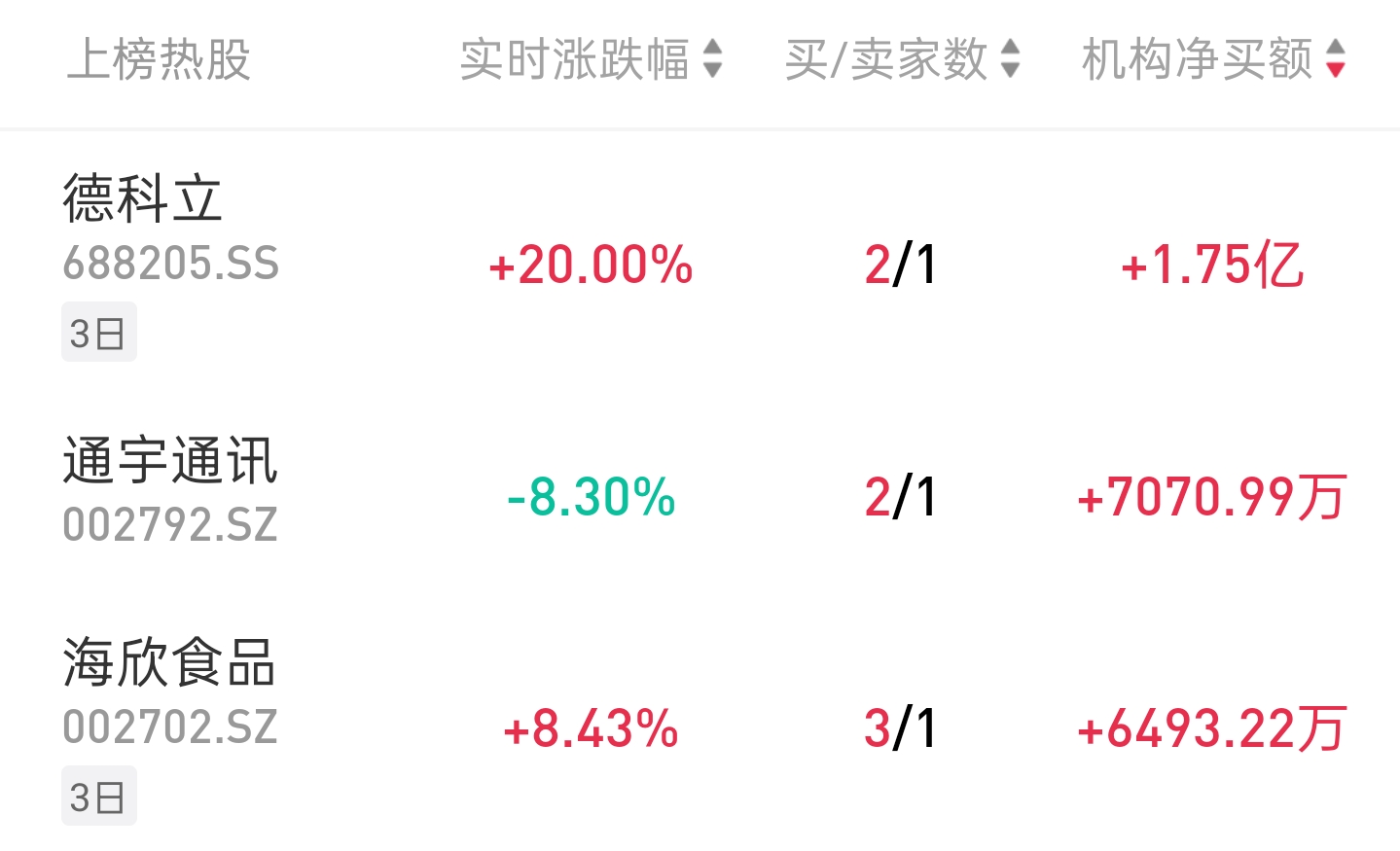 机构龙虎榜交易概况 - 当日机构龙虎榜共涉及41只个股,其中机构净买入23只,净卖出18只 [1] - 机构买入金额排名前三的个股为:德科立(净买入1.75亿元)、通宇通讯(净买入7070万元)、海欣食品(净买入6493万元) [1] 上榜个股及机构动向 - 德科立(688205.SS)当日涨停,涨幅为+20.00%,龙虎榜显示2家机构净买入1.75亿元 [1][2] - 通宇通讯(002792.SZ)当日下跌8.30%,龙虎榜显示2家机构参与 [2] - 海欣食品(002702.SZ)当日上涨8.43% [2] 相关公司业务信息 - 德科立为光传输全产业链企业,其400G相干模块已实现小批量试产,硅基OCS(光电路交换机)已获得海外样品订单 [2] - 永辉超市是国内大型连锁超市,总部位于福建省福州市 [2] - 南京商旅是南京旅游集团下属唯一控股上市公司,其旅游业务主要在子公司秦淮风光开展 [2] - 厦门港务实控人为厦门国资委,是厦门最大的港口码头运营商,主营业务受益于海西自贸区发展 [5] - 舒华体育位于福建泉州,是国内最具实力的健身器材和展示架制造企业之一 [5] 宏观政策与行业解读 - 中共中央政治局会议提出,要坚持内需主导,建设强大国内市场,并强调坚持创新驱动,加紧培育壮大新动能 [2] - 国信证券解读认为,会议将“消费”和“投资”统合为“内需”,旨在给予地方政府更大自由度,因地制宜实施“扩消费”或“促投资”政策 [3] - 申万宏源指出,政策明确“要坚持内需主导”,“十五五”主要目标提出“居民消费率明显提高”,并认为2024年居民商品消费已基本恢复,但人均服务消费较疫情前趋势值存在1923元缺口,可能成为政策突破方向 [4]