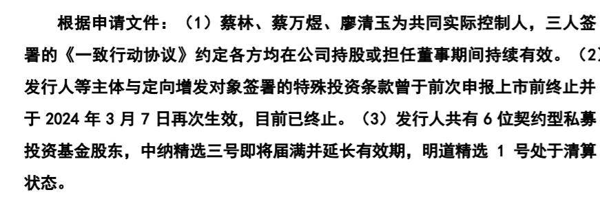 瑞财经 王敏 10月17日,据北交所,陕西瑞科新材料股份有限公司(以下简称"陕西瑞科")及开源证券披露关于第一轮问询的回 复,涉及股权清晰性、生产经营合规性等。 招股书显示,陕西瑞科主要从事贵金属催化剂的研发、生产、销售、加工及失活贵金属催化剂回收再加工等业务。 根据申请文件,蔡林、蔡万煜、廖清玉为共同实际控制人,三人签署的《一致行动协议》约定各方均在公司持股或担任董事期间 持续有效。 陕西瑞科等主体与定向增发对象签署的特殊投资条款曾于前次申报上市前终止并于2024年3月7日再次生效,目前已终止。 陕西瑞科共有6位契约型私募投资基金股东,中纳精选三号即将届满并延长有效期,明道精选1号处于清算状态。 北交所请陕西瑞科说明蔡林三人关于一致行动关系的安排是否符合《北京证券交易所向不特定合格投资者公开发行股票并上市业 务规则适用指引第1号》(以下简称《1号指引》)1-6实际控制人的认定与锁定期安排的规定。 同时,说明是否曾触发特殊投资条款,相关义务是否履行完毕,特殊投资条款是否真实解除,是否存在抽屉协议或其他替代利益 安排,是否存在纠纷或潜在纠纷。 此外,说明中纳精选三号展期进展情况,明道精选1号清算安排、是否需要并 ...