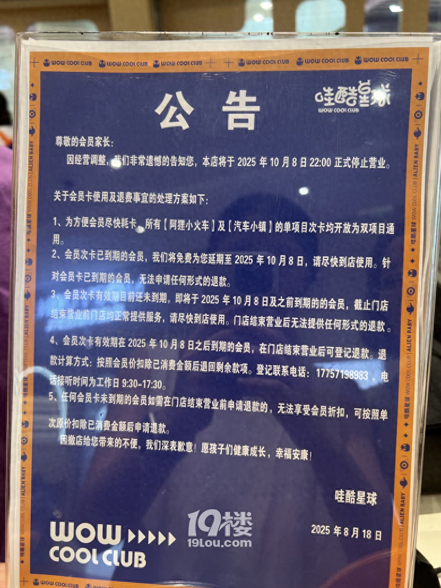 来源:FM93交通之声 你喜欢带娃去商场的儿童乐园玩吗? 为了方便和优惠不少人还会选择办卡 但最近杭州萧山奥体印象城哇酷星球 突然发了闭店公告 不少家长直呼无法接受 ↓↓↓ 据10月27日报道,记者收到网友投诉,投诉内容如下:奥体印象城哇酷星球悄无声息贴出公告,宣布因 与商场合同到期于10月8日闭店,但许多消费者购买的800元50次卡还未用完,甚至未收到任何通知! 记者联系到了网友,了解详细情况: | 有儿是球联合中心局 | | 市鼠壁 | 1次课■45分钟,一周 1-2次课,一个月 | 最显可转2次端+1次服运 | | --- | --- | --- | --- | --- | | 〔〔+0〕〕〕 | | | 内上完,所有课程缺课不顺适,有效期 | 年龄资末:0-32 | | 查测电话:19327616828 | | 课程价值:490元 | 内可安排补偿,过期作废 | (仪器制表面转露) | | 具)厂面建设(SKKRA | 庸山区、演江区、余杭区、富阳区、 | | | 最高可转3个半日托班, 高级连续3日内上完,请假不顺居; | | 虚快) | 临平区都有国区,可导航搜索目行区 | 托斯 | "次半天,有 ...