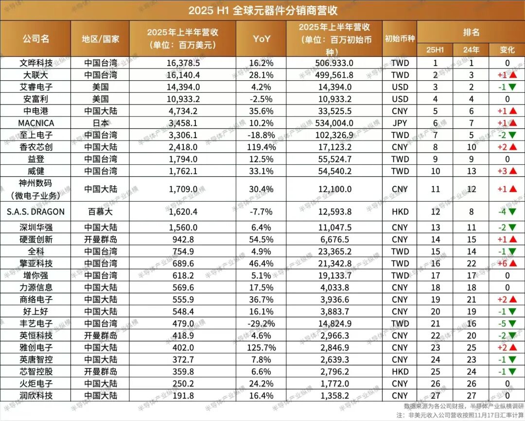 全球半导体及分销市场整体表现 - 2025年上半年全球半导体销售额为3,432亿美元,同比增长20.30% [1] - 同期全球主要元器件分销商上半年销售总和为873.6亿美元,约占全球半导体销售额的四分之一 [1] - 全球元器件分销商上半年营收增速达38.31%,中国大陆分销商增速略高,为38.33% [1] - 半导体产业纵横预测2025年全球前十分销商总销售额有望超过1608亿美元,较2024年总和约1599亿美元增长约1% [16] - 2025年下半年大部分公司第三季度营收增速低于上半年甚至出现负增长,原因包括AI增长放缓、存储涨价增加成本、以及国内消费电子补贴收缩 [18] 全球元器件分销商排名与竞争格局变化 - 文晔科技以2025年上半年营收163.785亿美元保持全球第一 [2] - 大联大上半年营收161.404亿美元,同比增长28.1%,超越艾睿电子晋升至全球第二,与文晔科技营收差距为2.4亿美元 [1][2] - 艾睿电子上半年营收143.94亿美元,同比增长4.2%,排名降至第三 [2] - 中电港上半年营收47.342亿美元,同比增长35.6%,取代至上电子进入全球前五 [1][2] - 至上电子上半年营收33.061亿美元,同比下滑18.8%,跌出全球前五 [1][2] - 威健上半年营收17.621亿美元,同比增长33.1%,排名从第13位跃升至第10位,进入全球前十 [2][3] - S.A.S. DRAGON(时捷集团)上半年营收16.204亿美元,同比下滑7.7%,跌出全球前十 [2][3] 头部公司业绩驱动因素与挑战 - 艾睿电子上半年利润为全球分销商最高,增长动力来自AI基础设施投资带动高毛利业务、工程设计与集成服务扩大、ECS事业部获得市场独家经营权带动经常性收入提升、以及亚太地区工业与交通运输领域需求稳定 [7][8] - 安富利上半年营收109.332亿美元,同比下滑2.5%,营收与利润双双下滑,主要受客户库存高企及终端需求疲软影响,其两大业务板块EC和Farnell销售额均出现回落 [8] - 至上电子营收下滑主因消费电子市场疲弱导致移动产品存储销量下滑,其收入比重从57%下降到47%,尽管服务器业务(含AI服务器)收入比重从20%增长到25% [9] - 香农芯创上半年营收24.18亿美元,同比增长119.4%,为全球增长最快公司,增长主要受第一大供应商SK海力士行情带动,但毛利率下降3.17%,且经营活动现金流净额为-4.98亿元人民币 [5] 中国大陆元器件分销市场表现 - 2025年上半年中国大陆分销商营收总额在统计中占比15.2%,高于2024年上半年的12.3% [14] - 中国大陆前三大分销商(中电港、香农芯创、神州数码微电子业务)合计市场份额超过66% [10] - 中电港上半年营收335.3亿元人民币(约47.342亿美元),同比增长35.6%,进入全球前十,其人工智能相关业务收入77.02亿元人民币,同比增长超140% [10] - 神州数码微电子业务上半年营收121亿元人民币,同比增长30.4%,进入中国大陆前三,该业务加速国产半导体布局,引入海思、长鑫等品牌 [14] - 雅创电子上半年营收28.5亿元人民币,同比增长125.7%,为大陆增长最快公司,增长主要受汽车电子与AI市场推动,若剔除收购的威雅利集团影响,原有业务增速为48.45% [15] - 2024年中国大陆主要分销商营收为1509亿元人民币,预测2025年有望增长至2110亿元人民币,实现40%的增长 [19] 关键产品与终端市场趋势 - AI成为上半年元器件市场最大增长动力,消费电子需求未完全恢复,工控与汽车市场相对稳定 [9] - 中电港上半年处理器业务收入同比增长77.33%,占其总收入40.78%,成为最强增长动力,存储器销售同比下降2.89% [10] - 全球半导体市场规模增长主要由与AI发展密切相关的逻辑芯片和存储芯片驱动 [18] - 存储产品大规模涨价给分销商经营成本带来压力,并影响了客户订单 [18]