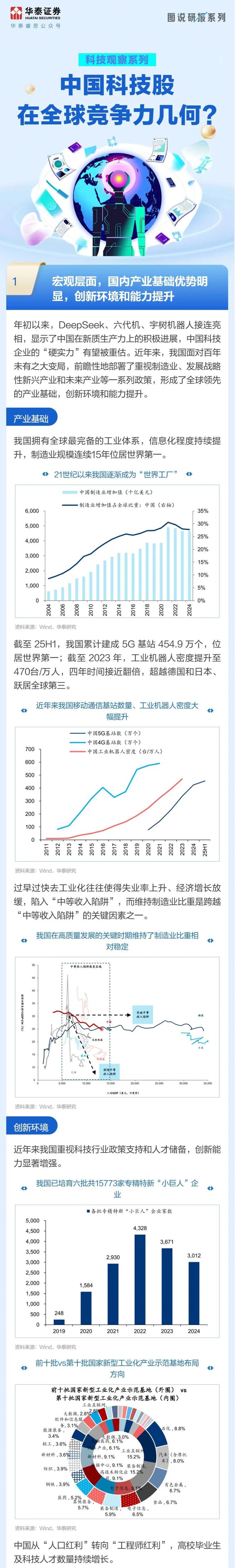 来源:市场资讯 (来源:华泰证券研究所) 让业的 使头刀 月呈恢里伯。 叮牛米,我国圓刈日午 未有之大变局,前瞻性地部署了重视制造业、发展战略 性新兴产业和未来产业等一系列政策,形成了全球领先 的产业基础,创新环境和能力提升。 产业基础 我国拥有全球最完备的工业体系,信息化程度持续提 升,制造业规模连续15年位居世界第一。 «> 21世纪以来我国逐渐成为"世界工厂" 制造业增加值(十亿美元) 制造业增加值占全球比重:中国(右轴) 6.000 35% 30% 5.000 4.000 3.000 2.000 1.000 0% 2016 2018 2012 2014 2008 2010 2022 004 2020 2024 资料来源: Wind,华泰研究 截至 25H1,我国累计建成 5G 基站 454.9 万个,位 居世界第一;截至 2023年,工业机器人密度提升至 470台/万人,四年时间接近翻倍,超越德国和日本、 跃居全球第三。 近年来我国移动通信基站数量、工业机器人密度大 幅提升 -中国5G基站数(万个) 中国4G基站数(万个) 700 中国工业机器人密度(台/万人) 600 500 400 300 200 ...