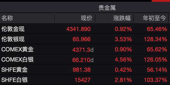 周三,美联储官员再次表示支持温和降息。黄金继续拉升,有色金属全线爆发。 截至发稿,伦敦金现报4341.890美元/盎司,最新涨幅为0.92%。伦敦银现维持高位,最新涨幅为 3.53%,COMEX白银涨幅更是扩大至4.56%。 | | 贵金属 | | | | --- | --- | --- | --- | | 名称 | 现价 | 涨跌幅 | 年初至今 | | 伦敦金现 | 4341.890 | 0.92% | 65.46% | | 伦敦银现 | 65.966 | 3.53% | 128.34% | | COMEX黄金 | 4371.3d | 0.90% | 65.62% | | COMEX自银 | 66.210d | 4.56% | 126.05% | | SHFE黄金 | 981.38 | 0.42% | 56.14% | | SHFE自银 | 15427 | 2.81% | 103.37% | 有色金属全线爆发。国内方面,沪锡主力合约涨超3%。国际方面,伦铜、伦锌、伦铅、伦镍均涨超 1%。 | 名称 | 最新 + | 涨幅 + | ■増仓 ⇒▶ | | --- | --- | --- | --- | | 沪 ...