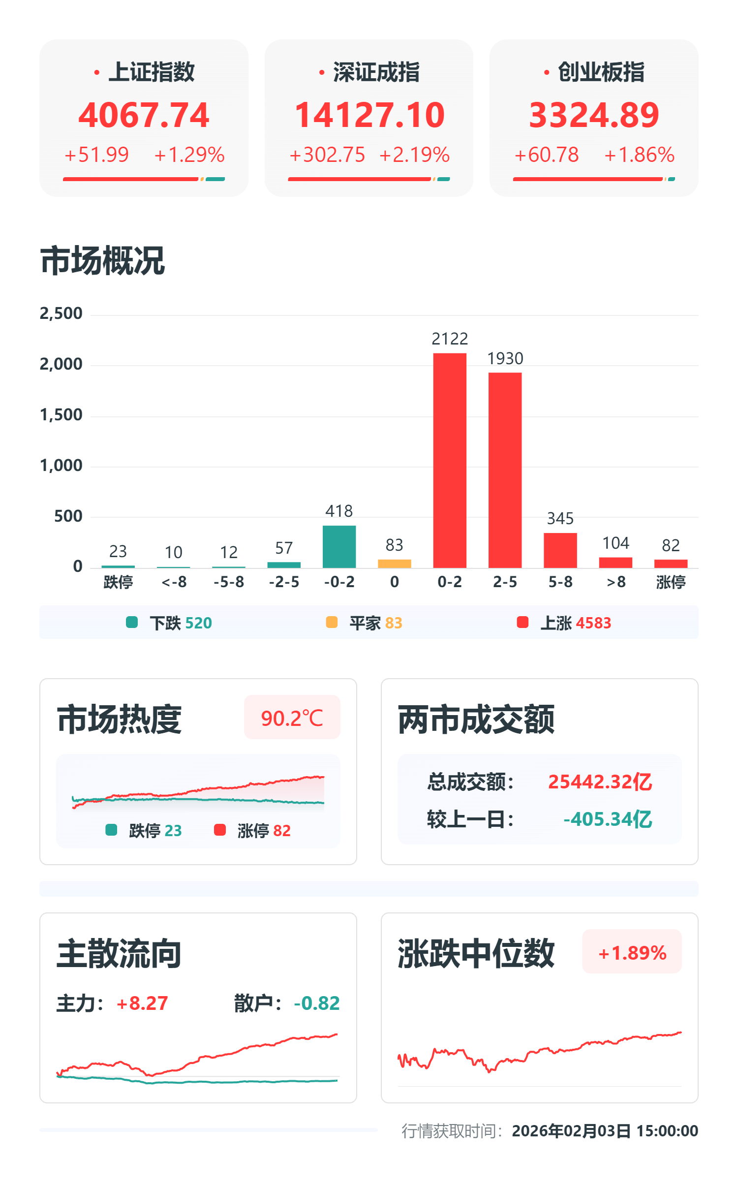 市场表现与指数动态 - 2月3日A股主要指数全线技术性反弹,上证指数涨1.29%报4067.74点,深证成指涨2.19%,创业板指涨1.86%,沪深300涨1.18%,科创50涨1.39% [1] - 市场呈现普涨格局,沪深两市4583股上涨,514股下跌,89股持平,两市合计成交额2.54万亿元,较前一交易日缩量约405.33亿元 [1] - 大盘主力资金净流入144.00亿元 [1] 行业与板块资金流向 - 通信设备、互联网服务、光伏设备、航天航空、电网设备等板块主力资金净流入居前 [7] - 有色金属、贵金属、证券、半导体、银行等板块主力资金净流出居前 [7] - 题材方面,太空光伏、BC电池、太空算力、船舶制造、光伏设备等涨幅居前,白银、银行、休闲食品等板块领跌 [7] 市场分析与后市观点 - 资深市场人士分析,市场当日高开后承接部分下跌惯性,早盘探底后一路上升,尾盘高位收盘,收复了前一交易日一多半跌幅 [7] - 该分析将当前市场与美股长牛行情类比,指出其对单日大阴线的免疫能力强,常出现连续阳线收复失地并创新高,认为这是长时间牛市带来的信心体现 [7] - 分析强调长时间的牛市必然是慢牛走势,快牛虽快但难以持久,只有用时间形成思维惯性才能构筑信心壁垒,并以黄金大跌时出现排队购买的现象作为类比 [7] - 该人士期待A股能够走出慢牛,并希望2026年成为A股慢牛元年,同时指出在趋势破位时需做好防守,待风险解除后再加仓 [7] - 趋势操作被奉为经典的原因在于其能使投资者避免在下跌中被套牢,在上涨中也不被轻易甩掉 [8]