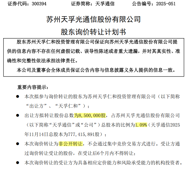 11月14日晚,天孚通信发布公告,公司控股股东苏州天孚仁和投资管理有限公司(以下简称"天孚仁和")拟参与询价转让。 根据公告,本次询价转让股份的数量为850万股,占天孚通信总股本的比例为1.09%,转让原因为自身资金需求。价格方面,本次询价转让的价格下限为 不低于发送认购邀请书之日(即11月14日,含当日)前20个交易日天孚通信股票交易均价的70%。 公告同时表示,本次询价转让的受让方为具备相应定价能力和风险承受能力的机构投资者;本次询价转让为非公开转让,不会通过集中竞价交易方式进 行;受让方通过询价转让受让的股份,在受让后6个月内不得转让。 值得注意的是,今年年内,天孚通信的第二大股东朱国栋也进行过减持及询价转让。 今年3月,天孚通信披露关于持股5%以上股东减持计划期限届满暨实施情况的公告,显示朱国栋在1月22日至3月20日期间减持公司股份345.12万股,减持 均价为98.34元/股;8月,天孚通信再度披露股东询价转让,朱国栋通过询价转让出让股份数量为990万股,询价转让价格为88.55元/股,交易金额为8.77亿 元。 资料显示,天孚通信是业界领先的光器件整体解决方案提供商和光电先进封装制造服务商,产品 ...