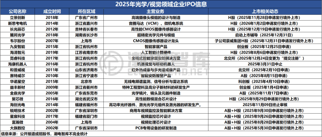 在过去的一年,早已完成上市的舜宇光学、丘钛科技、欧菲光、宇瞳光学等头部厂商,经营策略均以追求实体效益为重点,进行了相关产品结构调整,业 务端呈现多元化发展脉络。某些细分领域的优质企业,则在巩固自身竞争优势的同时,向各大证券交易板块发起了冲刺。 | | | | 2025年光学/视觉领域企业IPO信息 | | | --- | --- | --- | --- | --- | | 公司名称 | 成立时间 | 所在区域 | 主营业务 | 上市相关动态 | | 立景创新 | 2018年 | 广东省广州市 | 高端摄像头模组的设计与制造 | H股 (2025年11月28日申请发行境外上市) | | 新思考电机 | 2014年 | 浙江省嘉兴市 | 音圈马达(VCM)、微机电系统 | H股 (2026年1月2日申请发行境外上市) | | 长光辰心 | 2012年 | 吉林省长春市 | 高性能CMOS图像传感器设计 | H股 (2025年12月19日申请发行境外上市) | | 魔判光学 | 2018年 | 湖南省长沙市 | 超精密光学元件与模组 | 启动上市辅导 (2025年12月31日) | | 韦尔股份 | 2007年 | ...