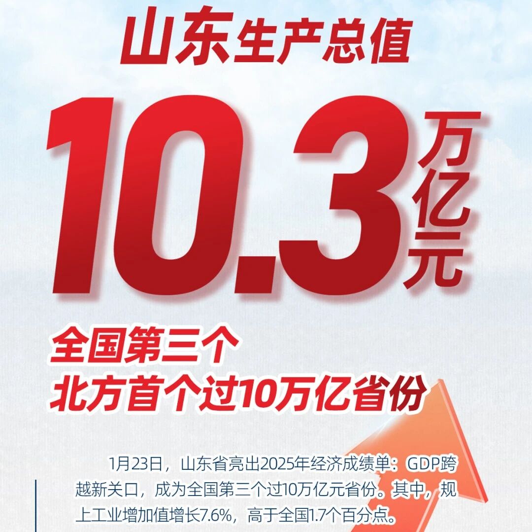 山东省2025年全年经济运行情况 - 2025年全年山东省生产总值为103197亿元 按不变价格计算 比上年增长5.5% 成为全国第三个 北方第一个过10万亿元省份 [2] - 第一产业增加值6775亿元 比上年增长4.0% [3] - 第二产业增加值40541亿元 比上年增长5.0% [3] - 第三产业增加值55881亿元 比上年增长6.1% [3]