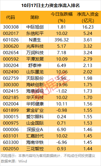 光模块龙头股中际旭创主力资金净流入16.23亿元,居首,收盘涨1.81%。公司在800G光模块领域全球市占率超30%,在微软、亚马逊等云巨头 2025年相关订单中拿下近60%份额,订单排期已延伸至2026年一季度。机构测算,仅现有高端订单即可支撑公司未来一年营收增长50%以上,形 成"订单锁死增长"的坚实基础。 (原标题:主力资金丨尾盘资金追捧8股) (原标题:主力资金 | 尾盘资金追捧8股) 电子行业遭主力资金净卖出超179亿元。 据证券时报·数据宝统计,今日(10月17日),沪深两市主力资金净流出794.56亿元,其中创业板净流出281.06亿元,沪深300成份股净流出266.27 亿元。 行业方面,31个申万一级行业全部下跌,电力设备行业跌幅居首,达4.99%;电力、机械设备和汽车行业均跌超3.5%;银行和交通运输行业跌幅 较小,分别为0.32%和0.53%。 从资金流向来看,仅商贸零售行业获主力资金净流入,金额为159.74万元。30个主力资金净流出的行业中,电子行业净流出金额为179.55亿元,居 首;电力设备和计算机行业净流出均超76亿元。 5股主力资金净流入超3亿元 从个股来看,有35股主力资金 ...