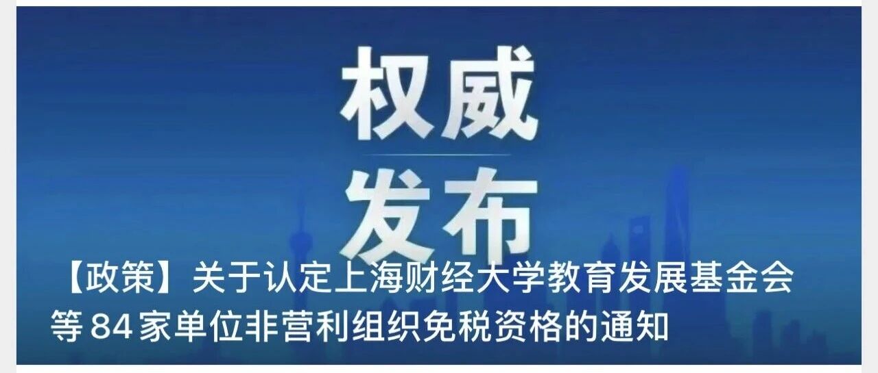 欢迎扫描下方二维码关注: 国家税务总局上海市税务局 上海市财政局 关于认定上海财经大学教育发展基金会等84家单位非营利组织免税资格的通知 沪税发〔2025〕64号 各区财政局,国家税务总局上海市各区税务局,国家税务总局上海市税务局第三税务分局: 根据《财政部 税务总局关于非营利组织免税资格认定管理有关问题的通知》(财税〔2018〕13号)的有关规定,经审核确认,上海财经 大学教育发展基金会等84家单位获得非营利组织免税资格。 特此通知。 附件: 上海市2025年第三批非营利组织免税资格认定名单 国家税务总局上海市税务局 上海市财政局 2025年11月26日 附件 上海市2025年第三批非营利组织免税资格认定名单 | 影营利免 | 非营利免 | 10 | 统一社会信用代码 | 非常利用刻名称 | 税资格申 | 税资格申 | 征管分局名称 | 1 | 8 | 请时间起 | 请时间止 | | --- | --- | --- | --- | --- | --- | --- | --- | --- | --- | --- | --- | | 53310000501780797F | 上海财经大学教育发展基金会 | 20 ...