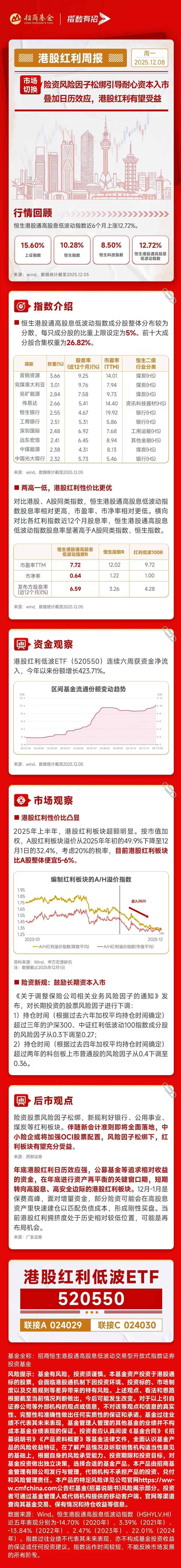 市场环境与资金流向 - 市场震荡背景下,年底港股红利日历效应强,在年底资产再平衡的关键窗口期,资金持续布局港股红利资产 [1] - 港股红利低波ETF(520550)连续六周获资金净流入,近五日揽金超7000万 [1] - 该ETF今年以来份额增长423.71% [11] 政策动态与影响 - 近期《关于调整保险公司相关业务风险因子的通知》发布,对长期投资的股票风险因子进行下调 [1][16] - 持仓时间超过三年的沪深300、中证红利低波动100指数成分股的风险因子从0.3下调至0.27 [1][16] - 持仓时间超过两年的科创板上市普通股的风险因子从0.4下调至0.36 [1][16] - 险资股票风险因子松绑,新规利好银行、公用事业、煤炭等红利板块 [1][17] - 伴随新会计准则即将全面落地,中小险企或将加强OCI股票配置,红利板块有望充分受益 [1][17] 港股红利板块投资价值分析 - 对比港股、A股同类指数,恒生港股通高股息低波动指数股息率相对更高,市盈率、市净率相对更低 [1][8] - 该指数近12个月股息率为6.59%,显著高于恒生指数的3.26%和红利低波100指数的4.28% [9] - 该指数市盈率TTM为7.72,市净率为0.64,均低于恒生指数和红利低波100指数 [9] - 按市值加权,A股红利板块溢价从2025年年初的49.9%下降至12月1日的32.4% [1][13] - 考虑20%的税率,目前港股红利板块比A股整体便宜5-6% [1][13] 相关指数与产品表现 - 恒生港股通高股息低波动指数近6个月上涨12.72% [4] - 港股红利低波ETF(520550)跟踪恒生港股通高股息低波动指数,全市场费率最低(综合费率0.2%) [2] - 该ETF持仓结构上,金融、能源、公用事业等成熟行业构筑安全垫,同时通过单一个股5%的权重上限实现风险分散 [2] - 恒生港股通高股息低波动指数成分股整体分布较为分散,每只成分股的比重上限设定为5%,前十大成分股合计权重为26.82% [6] - 指数前三大成分股为煤炭行业公司,包括首钢资源(权重3.66%)、兖煤澳大利亚(权重3.01%)和兖矿能源(权重2.84%) [7] 机构观点与后市展望 - 西部证券指出,险资股票风险因子松绑,新规利好银行、公用事业、煤炭等红利板块 [1][17] - 广发证券认为,年底港股红利日历效应强,公募基金等追求相对收益的资金在年底资产再平衡窗口期,短期转向高股息、高安全边际的港股红利板块 [17] - 12月-1月是保费高峰,面对增量资金,部分险资可能会在高股息资产里快速建仓以匹配负债成本,形成刚性买盘 [17] - 当前港股红利拥挤度处于历史相对较低位置,可能是再布局机会 [17]