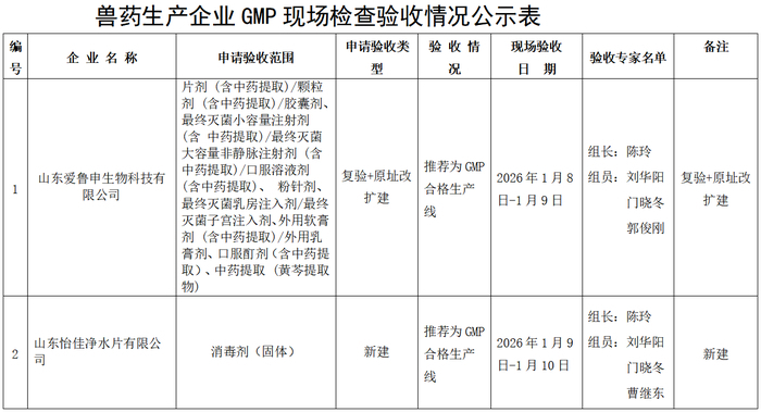 联系地址:济南市市中区站前路9号1号楼三层社会事务类B09窗口 据山东省畜牧兽医局1月14日消息,该局发布兽药GMP现场检查结果公示(2026年第二批)。根据《兽药 生产质量管理规范(2020年修订)》《兽药生产质量管理规范检查验收办法》,山东省畜牧兽医局派出检 查组对山东爱鲁申生物科技有限公司、山东怡佳净水片有限公司实施GMP的情况进行现场检查验收, 现将现场检查验收情况在山东省畜牧兽医局官网上予以公示,公示时间为2026年1月14日至2026年1月20 日。社会公众如有意见和建议,请反馈给山东省畜牧兽医局政策法规处(行政许可处)。 联系人:张呈军;联系电话:0531-82083151 | 编 | 企业名称 | 申请验收范围 | 申请验收类 | 验收 情 | 现场验收 | 验收专家名单 | 备注 | | --- | --- | --- | --- | --- | --- | --- | --- | | 号 | | | ਨ ਨੇ | ਸ | 日 期 | | | | | 山东爱鲁申生物科技有 限公司 | 片剂(含中药提取)/颗粒 剂(含中药提取)/胶囊剂、 最终灭菌小容量注射剂 (含 中药提取)/最终灭菌 大容 ...
