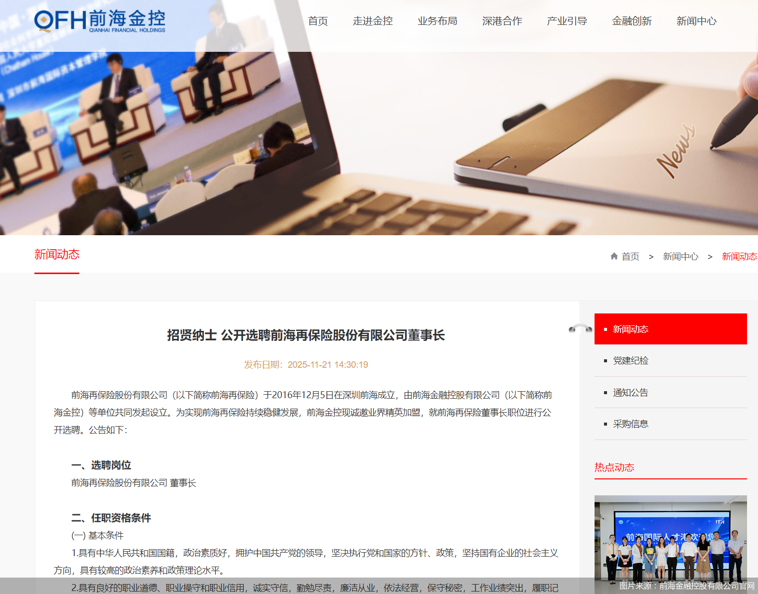 北京商报讯(记者 李秀梅)12月16日,北京商报记者注意到,近日前海再保险股份有限公司(以下简称"前海再保险")公开招聘董事长。岗位资格方面, 前海再保险提出了六项要求:原则上为中共党员,具有10年以上金融保险从业经历,5年以上中高层管理工作经验。熟悉国内外保险及再保险市场运行规律 和发展趋势,对宏观经济和金融政策有深刻理解。具备较强的战略决策能力和改革创新能力,能够主持制定并推动实施公司发展战略。熟悉现代企业治理, 具备优秀的董事会领导能力和团队整合能力。具备出色的沟通协调和资源整合能力,能够有效维护股东、监管等重要外部关系。工作业绩突出,符合国家金 融监督管理总局关于保险公司董事长的全部任职资格要求。 招聘要求提到,以上岗位如有特别优秀人选,可适当放宽年龄、任职或从业年限等条件(监管机构要求的相关任职资格除外)。 ...