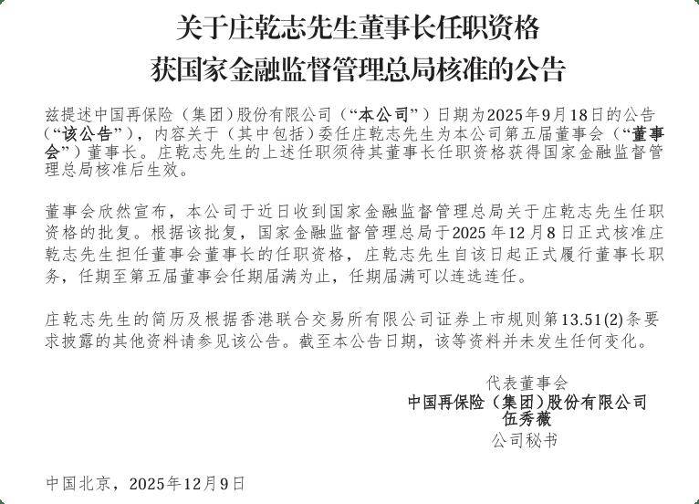 2025年12月9日,中国再保险(集团)股份有限公司(以下简称"中国再保")发布公告称,收到国家金融监督管理总局关于庄乾志任职资格的批复。庄乾志 担任第五届董事会董事长的任职资格已于2025年12月8日获得正式核准,其自同日起正式履行董事长职务。 公告显示,庄乾志的任期将至第五届董事会任期届满为止,任期届满后符合规定可连选连任。此次任职资格获批,标志着中国再保自今年9月董事会委任以 来的董事长人选最终落定,公司治理层面完成关键人事安排。 ...