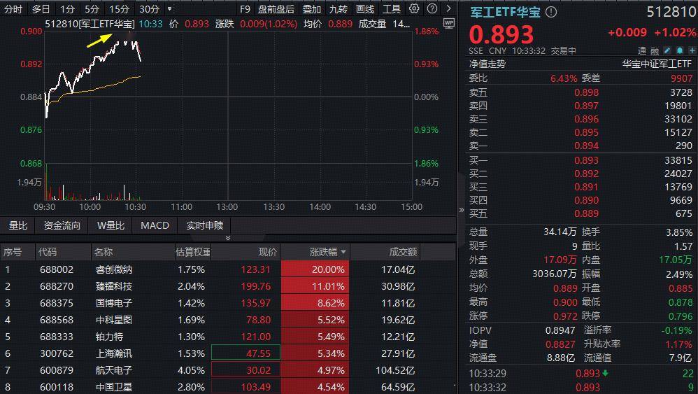 1月23日早盘,军工板块继续向上,高人气军工ETF华宝(512810)盘中摸高1.8%收复10日均线,日线 冲击三连阳。 成份股方面,睿创微纳20CM涨停创3年新高,臻镭科技涨超11%,商业航天概念再度活跃,国博电子、 中科星图、航天电子集体大涨。 | | | 分时 多日 1分 5分 15分 30分 ▼ | | | | | F9 盘前景后 图加 九龙 西线 工具 (9 (2) | | | > | 至工ETF华宝 ① | | 512810 | | --- | --- | --- | --- | --- | --- | --- | --- | --- | --- | --- | --- | --- | --- | | 000 | | | | | 512810[氧工ETF华宝] 10:33 价 0.693 脂肤 0.009(1.02%) 均价 0.889 脏交量 14 ... , | | | | | 18/95 | 0.893 | | +0.009 +1.02% | | | | | | | | | | | | | SSE CNY 10:33:32 文园中 | | 通政/ . + | | 0.802 | | | | ...