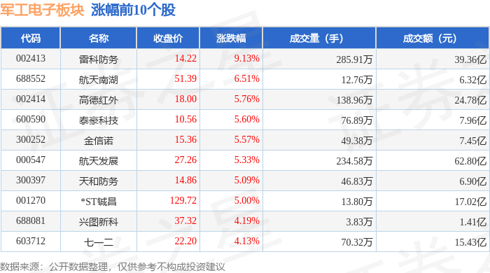 军工电子板块市场表现 - 1月22日,军工电子板块整体上涨2.17%,显著跑赢大盘,当日上证指数上涨0.14%,深证成指上涨0.5% [1] - 板块内个股普涨,领涨股雷科防务涨幅达9.13%,航天南湖、高德红外、泰豪科技、金信诺、航天发展、天和防务涨幅均超过5% [1] - 板块内亦有部分个股下跌,跌幅最大的是*ST万方,下跌5.11%,*ST奥维下跌4.94%,*ST大立下跌2.98% [2] 板块资金流向 - 当日军工电子板块整体呈现主力资金大幅净流入,净流入额为17.37亿元,同时游资净流入4018.39万元 [2] - 板块资金呈现明显的机构与散户博弈格局,散户资金净流出17.77亿元,与主力资金净流入额基本相当 [2] - 个股层面,上海瀚讯主力净流入额最高,达3.77亿元,主力净占比10.40%,北斗星通主力净流入1.75亿元,占比7.34% [3] - 高德红外、国博电子、雷科防务、泰豪科技、航天电器、华力创通、新劲刚、雷电微力等个股主力净流入额均超过9000万元 [3] 领涨及活跃个股详情 - 雷科防务为板块领涨股,收盘价14.22元,涨幅9.13%,成交额39.36亿元,成交量285.91万手,主力净流入1.37亿元 [1][3] - 航天发展成交额最高,达62.80亿元,涨幅5.33%,成交量234.58万手 [1] - 高德红外涨幅5.76%,收盘价18.00元,成交额24.78亿元,主力净流入1.66亿元 [1][3] - 泰豪科技涨幅5.60%,收盘价10.56元,成交额7.96亿元,主力净流入1.23亿元,主力净占比高达15.40% [1][3]