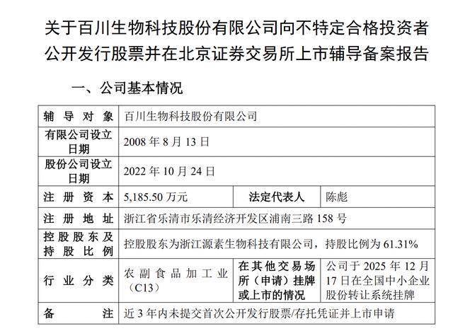 公司基本情况 - 公司全称为百川生物科技股份有限公司,成立于2008年8月13日,于2022年10月24日改制为股份公司,注册资本为5,185.50万元,注册地址位于浙江省乐清市 [1] - 公司控股股东为浙江源素生物科技有限公司,持股比例为61.31% [1] - 公司已于2025年12月17日在全国中小企业股份转让系统挂牌,行业分类为农副食品加工业(C13) [1] - 公司于2025年1月22日在浙江证监局完成北交所IPO辅导备案,辅导机构为财通证券股份有限公司 [1] 业务与产品 - 公司是一家专注于植物拉丝蛋白研发、生产和销售的高新技术企业,为客户提供植物拉丝蛋白的综合性解决方案 [2] - 公司目前主要产品以大豆蛋白、小麦蛋白、大米蛋白、花生蛋白、火麻仁蛋白等植物蛋白为原料,并不断向其他植物基材料领域拓展 [2] 财务表现 - 2023年、2024年及2025年前5月,公司营业收入分别为4.88亿元、4.87亿元、1.67亿元 [2] - 同期,公司净利润分别为4254.48万元、5705.97万元、2276.11万元 [2] - 同期,公司毛利率呈现上升趋势,分别为23.2%、25.51%、28.9% [2] - 2025年1-5月,公司扣除非经常性损益后的净利润为2155.22万元 [3] 股权结构与实际控制人 - 公司实际控制人为陈彪、付昌娇及陈琛煜家庭三人,三人签订了《一致行动协议》 [4][5] - 陈彪通过浙江源素持有并控制公司61.31%的股权,通过百川众一持有公司0.96%的股权 [3] - 付昌娇通过百川众一持有公司0.96%的股权,通过百川合一持有公司1.31%的股权 [3] - 陈彪、付昌娇夫妻通过上述主体合计持有公司64.54%的股权,合计控制公司61.31%的股权 [3] 核心管理层背景 - 陈彪,1966年7月出生,在职研究生学历,现任公司董事长兼总经理,曾任职于乐清市公安局及地方政府部门 [7] - 付昌娇,1967年5月出生,本科学历,现任公司副总经理,曾担任中学教师,并兼任浙江源素监事等职务 [7] - 陈琛煜,1993年2月出生,硕士研究生学历,现任公司董事、审计委员会委员兼技术质量中心总监,曾任职于国华人寿保险股份有限公司资产管理中心 [8]