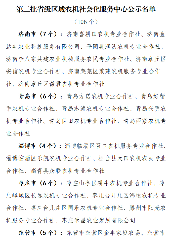 据从山东省农业农村厅消息,该厅发布第二批省级区域农机社会化服务中心公示名单。根据《山东省农 业农村厅关于开展第二批省级区域农机社会化服务中心遴选工作的通知》要求,经县级自评申报、市级 初评推荐、省厅组织专家评审,确定济南喜耕田农机专业合作社等106个农机服务中心为省级区域农机 社会化服务中心。现予公示。 公示期:2025年12月15日至12月19日。 公示期间如有异议,请向省农业农村厅农业机械化管理处反映。联系电话:0531-51788959。 第二批省级区域农机社会化服务中心公示名单 (106个) 济南市(7个):济南喜耕田农机专业合作社、济南金 达丰农业科技服务有限公司、平阴县润沃农机专业合作社、 济南李八家共建农业机械服务农民专业合作社、济南章丘区 安信农机专业合作社、济南莱芜区秉建农机服务专业合作 社、济南章丘区谦君农机专业合作社 青岛市(6个):青岛方诺农机专业合作社、青岛好帮 手农机专业合作社、青岛志涛农机专业合作社、青岛兴明农 机专业合作社、青岛保田农机专业合作社、青岛西寨农机专 业合作社 淄博市(4个):淄博临淄区召口农机服务专业合作社、 淄博临淄区乐凯农机专业合作社、桓台县大田农机农民专业 ...