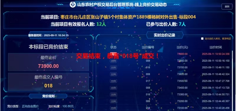 台儿庄五村联合杨树项目线上竞拍成功,20分钟溢价最高达85%