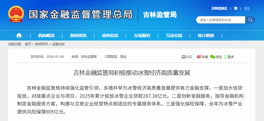 吉林金融监管局:2025年为冰雪产业提供风险保障905亿元