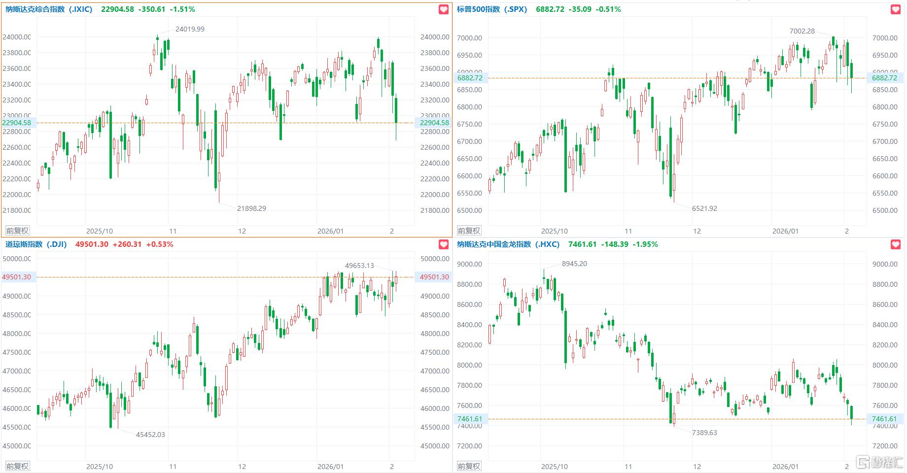 美股市场整体表现 - 美股三大指数收盘涨跌不一 道琼斯工业平均指数上涨0.53% 纳斯达克综合指数下跌1.51% 标普500指数下跌0.51% [1] - “小非农”ADP就业人数不及预期 [1] 科技与半导体行业 - 热门科技股普遍下跌 AMD股价下跌超过17% 创2017年以来最差单日表现 [1] - 英伟达、特斯拉、博通、Meta股价下跌超过3% 谷歌、亚马逊股价下跌超过2% [1] - 苹果公司股价逆势上涨超过2% [1] - 半导体设备与材料、存储概念股跌幅居前 美光科技股价下跌超过9% 西部数据股价下跌超过7% 应用材料股价下跌超过6% 阿斯麦股价下跌超过3% [1] - 闪迪股价下跌近16% [1] 其他特定行业与概念 - 减肥药概念股涨幅居前 礼来公司股价上涨超过10% 安进公司股价上涨超过8% 辉瑞公司股价上涨近4% [1] - 住宅地产板块涨幅居前 [1] - 加密矿企跌幅居前 Coinbase股价下跌超过6% [1] 中概股表现 - 纳斯达克中国金龙指数收跌1.95% [1] - 热门中概股表现分化 晶科能源股价上涨8% 百胜中国股价上涨4.6% 再鼎医药股价上涨3.7% 阿特斯太阳能股价上涨3.3% 理想汽车股价上涨2.2% [1] - 网易股价下跌5.3% 世纪互联股价下跌5.6% 文远知行股价下跌6.3% [1]