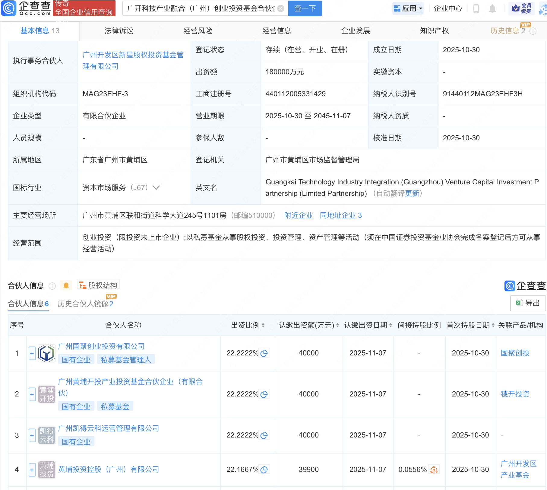 黄埔投资控股(广州)有限公司 4 | | | | 合伙人名称 | 出资比例 ÷ | 认缴出资额(万元 | | --- | --- | --- | --- | --- | --- | | | | | 州国聚创业投资有限公司 | 22.2222% (9 | 40000 | | | | | 国有企业 私募基金管理人 | | | | 2 | + | 通期 | 广州黄埔开投产业投资基金合伙企业(有限合 伙) | 22.2222% (9 | 40000 | | | | | 国有企业 私募基金 | | | | 3 | | 凯得 | 州凯得云科运营管理有限公司 + | 22.2222% (9 | 40000 | | | | 7 个 | 国有企业 | | | 企查查APP显示,近日,广开科技产业融合(广州)创业投资基金合伙企业(有限合伙)成立,出资额18亿元,经营范围包含:创业投资(限投资未上市企 业);以私募基金从事股权投资、投资管理、资产管理等活动。企查查股权穿透显示,该企业由广州国聚创业投资有限公司等共同出资。 | 全国企业信用查询 | | 广开科技产业融合(广州)创业投资基金合伙1 > | 查一下 | | --- |  ...