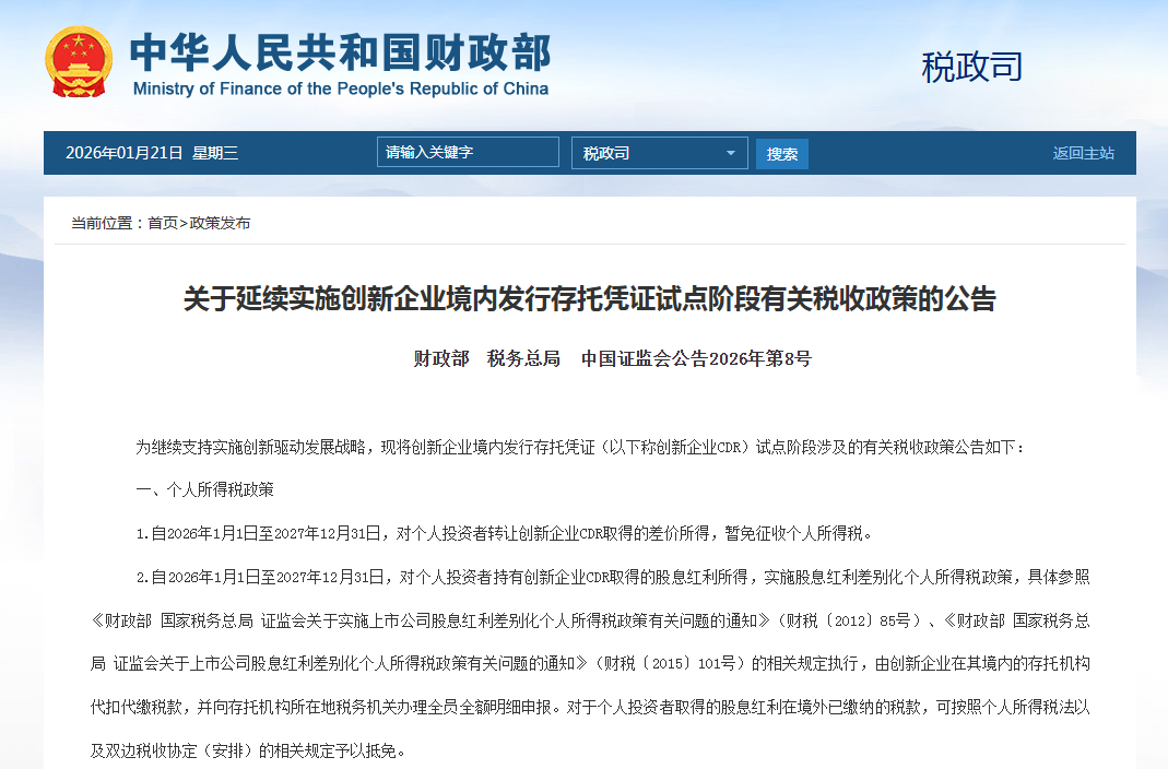 政策核心内容 - 财政部、税务总局、中国证监会联合发布公告,延续实施创新企业境内发行存托凭证试点阶段的税收优惠政策至2027年底 [6][7] - 该政策是对2023年启动的CDR税收优惠政策的延期,体现了国家对科技创新企业融资渠道建设的持续支持 [3] 个人所得税政策 - 自2026年1月1日至2027年12月31日,对个人投资者转让创新企业CDR取得的差价所得,暂免征收个人所得税 [2][7] - 在同一期间,对个人投资者持有创新企业CDR取得的股息红利所得,实施股息红利差别化个人所得税政策 [2][7] - 股息红利税由创新企业在其境内的存托机构代扣代缴,并办理全员全额明细申报 [2][7] - 个人投资者取得的股息红利在境外已缴纳的税款,可按相关规定予以抵免 [2][7] 企业所得税政策 - 对企业投资者转让和持有创新企业CDR取得的所得,按转让股票差价所得和持有股票的股息红利所得政策规定征免企业所得税 [8] - 对公募证券投资基金转让和持有创新企业CDR取得的所得,按公募证券投资基金税收政策规定暂不征收企业所得税 [8] - 对QFII、RQFII转让和持有创新企业CDR取得的所得,视同转让或持有基础股票取得的权益性资产所得征免企业所得税 [8] 增值税政策 - 对个人投资者转让创新企业CDR取得的差价收入,暂免征收增值税 [9] - 对单位投资者转让创新企业CDR取得的差价收入,按金融商品转让政策规定征免增值税 [9] - 自2026年1月1日至2027年12月31日,对公募证券投资基金管理人运营基金过程中转让创新企业CDR取得的差价收入,暂免征收增值税 [9] - 对QFII、RQFII委托境内公司转让创新企业CDR取得的差价收入,暂免征收增值税 [9] 政策背景与定义 - 创新企业CDR是指符合国办发〔2018〕21号文规定的试点企业,以境外股票为基础证券,在境内发行的证券 [9] - CDR是境外上市公司将部分股票托管在境外,由境内存托银行发行、在A股上市、以人民币交易的投资凭证 [3] - 九号公司于2020年10月29日在科创板上市,成为境内“VIE+CDR第一股” [6]