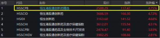 港股创新药"王者归来"!昨日简单"热身"后,今日(11月13日)彻底爆发,港股通创新药ETF (520880)跟踪的恒生港股通创新药精选指数尾盘上探5.31%强势站上半年线,大幅跑赢恒指 (+0.56%)、恒科指(+0.8%),并领跑一众恒生创新药主题指数! | 序号 | 代码 | 名称 | 现价 | 涨跌 | 涨跌幅 ▼ | | --- | --- | --- | --- | --- | --- | | 1 | HSSCPB | 恒生港股通创新药精选 | 2588.29 | 117.47 | 4.75% | | 2 | HSSCID | 恒生港股通创新药 | 3686.59 | 166.30 | 4.72% | | 3 | HSIDI | 恒生创新药 | 3163.60 | 141.52 | 4.68% | | 4 | HSSCHI | 恒生港股通创新药及医疗保健指数 | 3612.01 | 155.94 | 4.51% | | ਦੇ | HSSCPBI | 恒生港股通药品及生物技术(可投资 | 2478.47 | 91.40 | 3.83% | | ર | HSSCHIDV | 恒生港股通创新药及医疗保健 ...