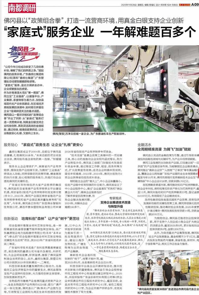 2025年11月28日 星期五 编辑 期權红 设计 和诗君 校计 刘维文 陆歌剧团剧 A 09 县以"政策组合拳",打造一流营商环境,用真金白银支持企业创新 -年解难题自 家庭式"服务企\ 补贴,倒能了投资的数据之量 test and and the many of 家庭式 隔离,我此次调研步访4 企业绩整提及的展示 作为环粤港澳大向区"第 冈立足"工业强县",以建强平台、 业集团、承移驻移为差力点,加快县 域膜代化产业体系建设。在区域经 资相发展的漫画中,如何吸引并留住 企业2是调研团关注的画点详细 佛冈县以一套环环相扣的"改算组 学"作出了回答:从"家庭式"服务打 进一流营商环境,到真金白银支持企 业科技创新,再到武志愿效的宜龄国 說,通过持续、精准的政策供给,让企 业股能安心扎根,又能同上生长。 服务贴心 "家庭式"政务生态 让企业"扎根 處炭仕集团成立手2004年,总部位于维度葛 汤墙罐,扎根健风20余年。"未来道能的观目体体 文理册,佛冈始终最法册地的第一选择。"然相情 费示。 股券发电力量度,以前就是可在十段冷却 转移,围绕优势产业招顾引领,为佛冈"工业强县" 棒续进入动能:而持续稳定的政策环境, ...
