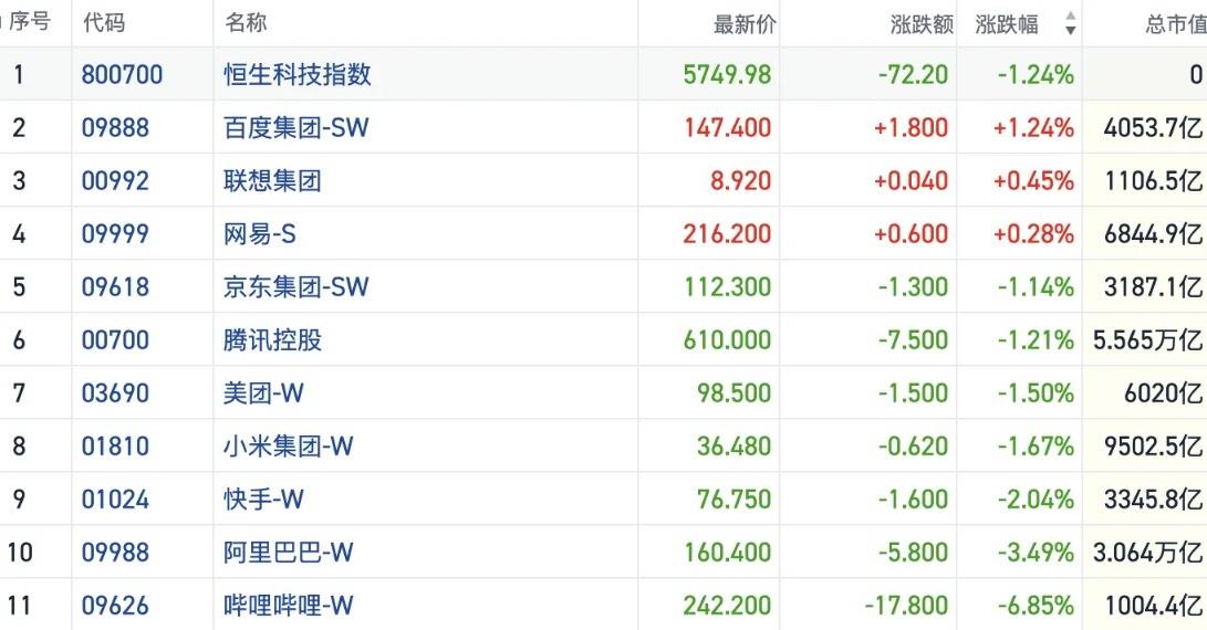 港股市场整体表现 - 港股短线再度震荡向下,调整压力愈发明显,恒生科技指数下跌72.20点,跌幅1.24%至5749.98点 [1][4] - 市场成交额显著萎缩,恒指全天成交2256.89亿港元,连续第4日收缩且创下开年以来新低 [4] - 市场沽空情绪低位徘徊,总沽空金额为211.93亿港元,占恒指成交额的9.39% [4] 大型科技股表现 - 大型科网股集体弱势,阿里巴巴-W股价下跌5.80港元,跌幅3.49%至160.40港元,总市值3.064万亿港元 [1][2] - 小米集团-W股价下跌0.62港元,跌幅1.67%至36.48港元,总市值9502.5亿港元,再创阶段新低 [1][2] - 腾讯控股股价下跌7.50港元,跌幅1.21%至610.00港元,总市值5.565万亿港元 [2] - 美团-W股价下跌1.50港元,跌幅1.50%至98.50港元,总市值6020亿港元 [2] - 京东集团-SW股价下跌1.30港元,跌幅1.14%至112.30港元,总市值3187.1亿港元 [2] - 哔哩哔哩-W股价下跌17.80港元,跌幅6.85%至242.20港元,总市值1004.4亿港元 [2] - 部分科技股逆势上涨,百度集团-SW股价上涨1.80港元,涨幅1.24%至147.40港元,总市值4053.7亿港元 [2] 行业板块表现 - 航空股涨幅居前,电力设备股指数上涨26.868点,涨幅2.64%至1044.433点,总市值4060.4亿港元 [3][7] - 风电股指数上涨70.393点,涨幅3.12%至2327.773点,总市值2760.6亿港元 [7] - 核电股指数上涨29.571点,涨幅1.87%至1609.366点,总市值2026.4亿港元 [7] - 石油股指数上涨12.849点,涨幅0.76%至1708.219点,总市值3.264万亿港元 [7] - 航运及港口股指数上涨12.148点,涨幅0.53%至2300.847点,总市值6635.3亿港元 [7] - AI应用等热点概念板块剧烈回调,AI应用板块指数下跌28.794点,跌幅1.94%至1453.905点,总市值13.78万亿港元 [6][7] - 人工智能板块指数下跌25.424点,跌幅1.79%至1391.282点,总市值16.59万亿港元 [7] - 生物医药板块指数下跌38.595点,跌幅2.63%至1430.065点,总市值1.363万亿港元 [2][7] - 创新药概念板块指数下跌41.115点,跌幅2.43%至1647.447点,总市值2.873万亿港元 [7] - 加密货币概念股指数下跌87.974点,跌幅2.96%至2887.689点,总市值1183.3亿港元 [7] 市场情绪与资金动向 - 活跃资金在前期涨幅巨大的AI应用端出现止盈意愿,相关板块龙头个股跌幅超过10% [6] - 市场避险情绪升温,风险偏好明显走低,受美欧关税博弈、中东地缘风险及港股前期涨幅较大后获利了结等多重利空因素叠加影响 [7] - 沽空金额居前的个股包括小米集团-W(17.12亿港元)、阿里巴巴-W(12.46亿港元)和泡泡玛特(7.61亿港元) [5] 关联市场表现与后市展望 - A股市场走势偏向震荡防御,上证指数微涨0.29%,沪深两市成交额2.71万亿,较上一交易日缩量3179亿 [8] - 分析认为港股仍在震荡向上的大趋势中,但短期面临考验,市场对国内基本面共识强烈,但对海外因素分歧较多 [10] - 海外投资者对美股AI科技财报持观察态度,若美股AI科技回调可能影响港股相关板块,同时海外市场普遍下调了美联储降息预期 [10]