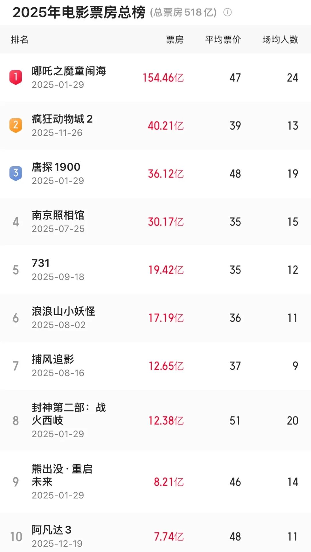 在2025年不太乐观的电影市场中,唯一带来暖意的,就属动画电影的全面爆发了。 国产动画,已稳稳占据半壁票房江山。2025年全年全国总票房达518.32亿元(国家电影局1月1日官方数据),其中国产动画票房252.07亿元、占比 48.63%,较2019年峰值翻倍,年度票房前十中动画占四席。其中,《哪吒之魔童闹海》独揽全年总票房的29.8%,堪称年度影市"压舱石"。 以154.46亿元票房登顶国产电影冠军的《哪吒之魔童闹海》,相比亚军《唐探1900》的36.12亿元高出超 118.34亿元,呈现显著断层优势;《浪浪山小妖 怪》拿下17.19亿元票房刷新国产二维动画纪录,头部与腰部作品衔接顺畅,形成良性梯队。 | 排名 | | 票房 | 平均票价 | 场均人数 | | --- | --- | --- | --- | --- | | 1 | 哪吒之魔童闹海 | 154.46亿 | 47 | 24 | | | 2025-01-29 | | | | | 2 | 疯狂动物城 2 | 40.21亿 | 39 | 13 | | | 2025-11-26 | | | | | 3 | 唐探 1900 | 36.12亿 | 48 | ...