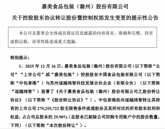 12月16日晚间,嘉美食品包装(滁州)股份有限公司(以下简称"嘉美包装(002969)")发布控股股东协议 转让股份暨控制权拟发生变更的公告。 公告显示,12月16日,嘉美包装控股股东中国食品包装有限公司(以下简称"中包香港")与苏州逐越鸿智 科技发展合伙企业(有限合伙)(以下简称"逐越鸿智")签署了《股份转让协议》。同日,公司股东富新投 资有限公司、中凯投资发展有限公司分别与苏州逐越鸿智科技发展合伙企业(有限合伙)签署了《预先接 受要约收购的协议》。 据了解,本次交易完成后,嘉美包装控股股东将由中包香港变更为逐越鸿智,追觅科技创始人俞浩将成 为嘉美包装实际控制人。 业内人士表示,得益于俞浩丰富的企业运营管理经验、追觅科技的产业资源与科技创新力,入主嘉美包 装后,逐越鸿智将依托自身战略资源,在企业数字化、智能制造、新材料应用及供应链优化等方向赋能 嘉美包装,推动包装行业向智能化、高端化、全球化转型,为公司发展注入新动能、增强市场竞争力。 公开信息显示,嘉美包装是一家全产业链服务于饮料品牌的平台企业,为客户提供全品类饮料包装容器 的研发、设计、生产、销售,同时为客户提供全品类的饮料配方研发、灌装生产及饮料渠道营 ...