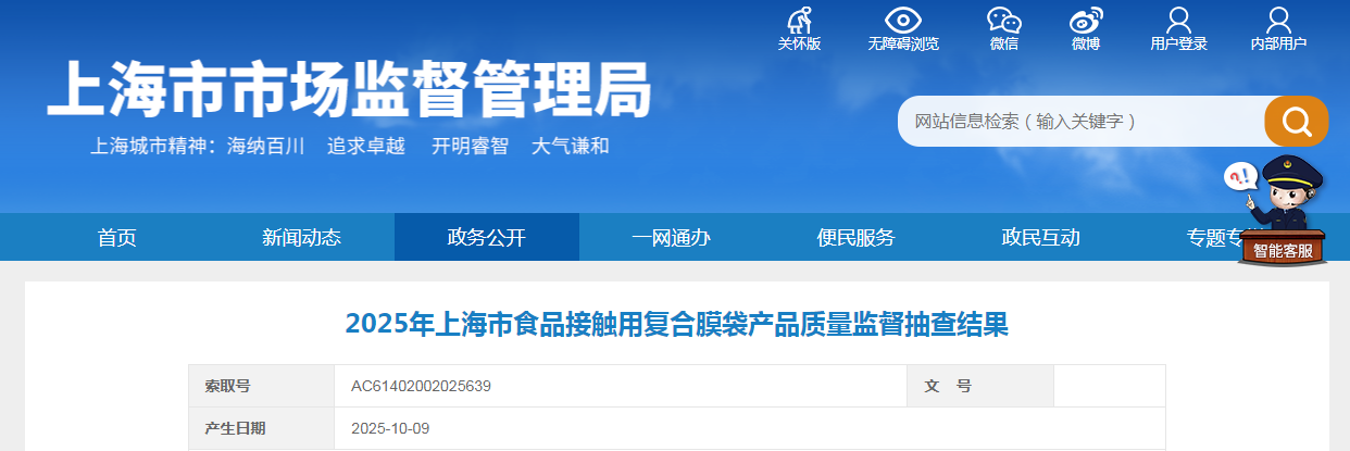 | | | | 安蒙 | | (0) 无障碍浏览 | પછ 微信 | (2) 微博 | 用户登 | | --- | --- | --- | --- | --- | --- | --- | --- | --- | | 上海市市场监督管理局 上海城市精神:海纳百川 追求卓越 开明睿智 大气谦和 | | | | | | 网站信息检索(输入关键字) | | | | 政务公开 首页 | 新闻动态 | 一网通办 | | 便民服务 | | 政民互动 | | | | 索取号 | AC61402002025639 | 文 号 | | --- | --- | --- | | 产生日期 | 2025-10-09 | | 中国质量新闻网讯 据上海市市场监督管理局网站消息,近期,上海市市场监督管理局对本市生产的食品接触用复合膜袋产品质量进行了监督抽查。本次抽 查了40批次产品。经检验,未发现不合格。 本次监督抽查依据SHSSXZ0220-2025《食品接触用复合膜袋上海市产品质量监督抽查实施细则》组织实施。 2025年上海市复合膜袋产品质量监督抽查所检项目符合相关标准的产品 | 样品标称名称 | 标称 | 标称规格型号 | 标称生产日 ...