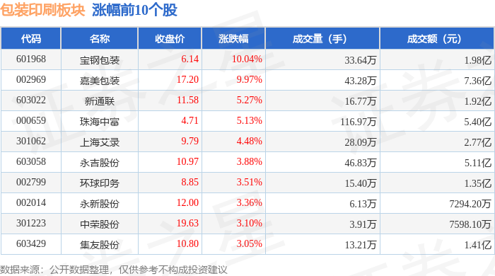 证券之星消息,1月19日包装印刷板块较上一交易日上涨1.87%,宝钢包装领涨。当日上证指数报收于 4114.0,上涨0.29%。深证成指报收于14294.05,上涨0.09%。包装印刷板块个股涨跌见下表: | 代码 | 名称 | 收盘价 | 涨跌幅 | 成交量(手) | 成交额(元) | | --- | --- | --- | --- | --- | --- | | 601968 | 宝钢包装 | 6.14 | 10.04% | 33.64万 | 1.9867 | | 002969 | 嘉美包装 | 17.20 | 9.97% | 43.28万 | 7.36亿 | | 603022 | 新通联 | 11.58 | 5.27% | - 16.77万 | 1.92亿 | | 000659 | 珠海中富 | 4.71 | 5.13% | 116.97万 | 5.40亿 | | 301062 | 上海艾灵 | 9.79 | 4.48% | 28.09万 | 2.77亿 | | 603058 | 永吉股份 | 10.97 | 3.88% | 46.83万 | 5.11亿 | | 002799 | 环球印务 | 8.85 ...