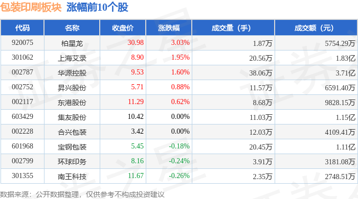 | 代码 | 名称 | 收盘价 | 涨跌幅 | 成交量(手) | 成交额(元) | | --- | --- | --- | --- | --- | --- | | 002846 | 英联股份 | 16.91 | -5.53% | 17.31万 | 2.97亿 | | 601515 | 东峰集团 | 4.55 | -4.41% | 34.05万 | 1.57亿 | | 603687 | 大胜达 | 9.00 | -3.85% | 16.86万 | 1.53亿 | | 002735 | 王子新材 | 16.52 | -3.62% | 43.51万 | 7.29亿 | | 920274 | 宏裕包材 | 32.07 | -3.58% | 1.65万 | 5449.12万 | | 603058 | 永吉股份 | 66"8 | -2.92% | 9.32万 | 8457.29万 | | 002191 | 劲嘉股份 | 4.67 | -2.51% | 52.56万 | 2.51亿 | | 603499 | 翔港科技 | 16.79 | -2.38% | 7.11万 | 1.21亿 | | 603091 | 众鑫股份 | ...