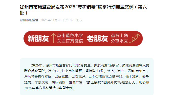 江苏省徐州市市场监管局发布2025“守护消费”铁拳行动典型案例(第六批)