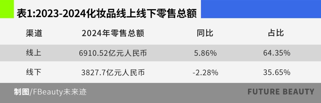线下渠道概况 根据中国香妆协会产业研究中心统计,2024年线下渠道化妆品零售总额为3827.7亿元,同比下滑2.28%。占2024年化妆品线上线下全渠道零售总额的 35.65%。 | | 表1:2023-2024化妆品线上线下零售总额 | | | | --- | --- | --- | --- | | 渠道 | 2024年零售总额 | 同比 | 与比 | | 线上 | 6910.52亿元人民币 | 5.86% | 64.35% | | 线下 | 3827.7亿元人民币 | -2.28% | 35.65% | 其中2024年百货和购物中心渠道,化妆品零售总额1471.79亿元,同比下滑8.8.%;超市渠道化妆品零售总额为698.39亿元,同比增长7%;化妆品店渠道零 售总额为1441.57亿元,同比下降1.91%;OTC药店渠道化妆品零售总额21.7亿元,同比下降4.4%;便利店渠道化妆品零售总额为194.26亿元,同比增长 4.5%。 | 表2:2024化妆品线上线下零售总额 | | | | | --- | --- | --- | --- | | 渠道 | 2024年零售总额 | 同比 | 足 | | 百货商 ...