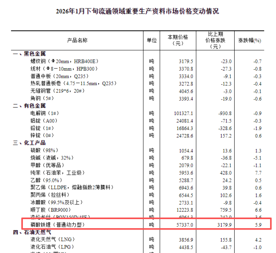 磷酸铁锂价格走势 - 2026年1月下旬,磷酸铁锂(普通动力型)市场价格为57,337元/吨,较1月中旬上涨3,179.9元,环比涨幅达5.9% [1][8] - 2026年1月全月,磷酸铁锂价格呈现连续快速上涨态势:1月上旬价格为49,980元/吨,1月中旬升至54,157.1元/吨,1月下旬进一步升至57,337元/吨 [6][11] - 按国家统计局分旬序列计算,磷酸铁锂价格在2026年1月上旬至下旬累计上涨7,357元/吨,累计涨幅约14.7% [6][11] 行业监测与市场地位 - 2026年1月,磷酸铁锂首次被纳入国家统计局对全国流通领域50种重要生产资料的监测表,并以每月上旬、中旬、下旬的频率连续披露价格 [4][9] - 在2026年1月下旬监测的50种重要生产资料中,共有25种产品价格上涨,21种下降,4种持平,磷酸铁锂是价格上涨的品种之一 [1][8] 技术升级与标准制定 - 进入2025年,高压实密度磷酸铁锂技术(第4-5代磷酸铁锂技术)路线正处于爆发风口,市场热情高涨,并逐渐成为磷酸铁锂材料市场主流 [7][12] - 高压实密度磷酸铁锂材料的需求驱动主要来自超快充电池的刚需,其价格比传统磷酸铁锂材料高2000-3000元每吨 [7][12] - 中国电子材料行业协会电池材料分会正在组织制定《高压实密度磷酸铁锂材料》团体标准,旨在规范核心工艺参数,明确压实密度目标,以提升量产良率、支撑快充等需求并降低电芯制造成本 [7][12] 其他重要生产资料价格对比 - 在化工产品类别中,2026年1月下旬纯苯(石油苯,工业级)价格环比上涨7.7%,顺丁胶(BR9000)环比上涨6.6%,涨幅显著 [2][9] - 液化天然气(LNG)在2026年1月下旬价格环比上涨4.2% [2][9] - 部分化工产品价格下跌,如烧碱(液碱,32%)在2026年1月下旬价格环比下跌5.1% [2][9]