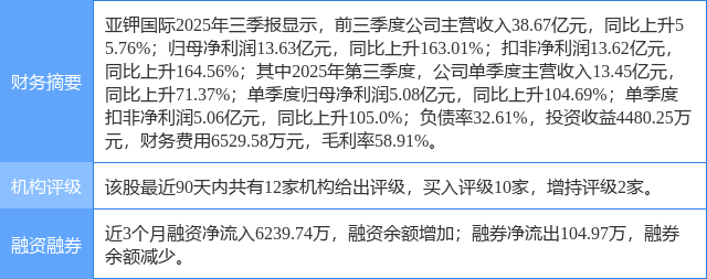 今日亚钾国际(000893)涨6.16%,收盘报55.3元。 亚钾国际(000893)个股概况: | 财务摘要 | 亚押国际2025年三季报显示,前三季度公司主营收入38.67亿元,同比上升5 5.76%; 归母净利润13.63亿元,同比上升163.01%; 扣非净利润13.62亿元, | | --- | --- | | | 同比上升164.56%;其中2025年第三季度,公司单季度主营收入13.45亿元, 同比上升71.37%;单季度归母净利润5.08亿元,同比上升104.69%;单季度 | | | 扣非净利润5.06亿元,同比上升105.0%;负债率32.61%,投资收益4480.25万 元,财务费用6529.58万元,毛利率58.91%。 | | 机构评级 | 该股最近90天内共有12家机构给出评级,买入评级10家,增持评级2家。 | | 融资融券 | 近3个月融资净流入6239.74万,融资余额增加;融券净流出104.97万,融券 | | | 余额减少。 | 2025年10月31日,中国银河研究员王鹏,孙思源发布了对亚钾国际的研报《25Q3盈利稳中有增,静待新 产能投放》,该研报对亚钾国际给出"买入" ...