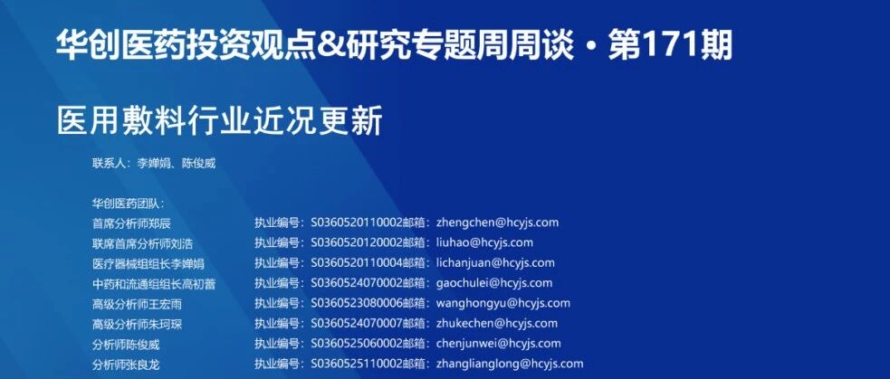 www.hczq.com 证券研究报告 | 医药生物 | 2026年4月18日 华创医药投资观点&研究专题周周谈 · 第171期 医用敷料行业近况更新 联系人:李婵娟、陈俊威 | 华创医药团队: | | | --- | --- | | 首席分析师郑辰 | 执业编号:S0360520110002邮箱:zhengchen@hcyjs.com | | 联席首席分析师刘浩 | 执业编号:S0360520120002邮箱:liuhao@hcyjs.com | | 医疗器械组组长李婵娟 | 执业编号:S0360520110004邮箱:lichanjuan@hcyjs.com | | 中药和流通组组长高初蕾 | 执业编号:S0360524070002邮箱:gaochulei@hcyjs.com | | 高级分析师王宏雨 | 执业编号:S0360523080006邮箱:wanghongyu@hcyjs.com | | 高级分析师朱珂琛 | 执业编号:S0360524070007邮箱:zhukechen@hcyjs.com | | 分析师陈俊威 | 执业编号:S0360525060002邮箱:chenjunwei@hcyjs. ...
