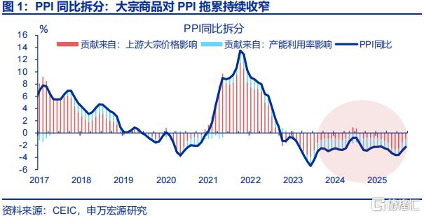 本文来自格隆汇专栏:申万宏源宏观;作者:赵伟 屠强 摘要 事件:10月15日,国家统计局公布9月通胀数据,CPI同比-0.3%、前值-0.4%、市场预期-0.1%、环比0.1%;PPI同 比-2.3%、前值-2.9%、市场预期-2.4%、环比0%。 核心观点:大宗涨价提振上游PPI,黄金与家电价格走高对中下游CPI也有较大拉动。 线索一:9月PPI改善,主因大宗价格延续上涨,但主要是受反内卷影响较小的铜价大幅上涨。9月PPI环比0%。从影 响因素看,国内大宗商品中,9月以来铜价再度出现回涨(环比2.1%),对应有色采选、有色压延业CPI环比分别 2.5%、1.2%,拉动PPI环比0.1%,为主要贡献项。煤价也继续上涨,对应煤价拉动PPI环比0.1%。但中下游产能利用 率偏低导致中下游价格无法充分反映上游涨价传导,测算该因素拖累PPI环比-0.1%。 线索二:整体CPI偏低主因食品价格拖累,核心CPI涨幅仍在扩大,结构上黄金价格的拉动作用持续增强。9月CPI环 比0.1%,不及2017年来均值(0.4%);其中核心CPI同比上行至1.1%,结构上源于核心商品CPI(同比+0.5pct至 1.4%)。其中金价对核 ...