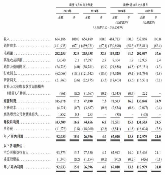 据港交所近日披露,上海生生医药冷链科技股份有限公司("上海生生")向港交所主板递交上市申请,中 金公司、国金证券(香港)为其联席保荐人。 | | | 截至12月31日止年度 | | | | 截至9月30日止九個月 | | | | --- | --- | --- | --- | --- | --- | --- | --- | --- | | | 2023年 | | 2024年 | | 2074年 | | 2025 章 | | | | 全部 | | 全面 15 | | 全面 | 5 | 全部 | 15 | | | | | | | (北重要》) | | (保留事計) | | | | | | | (人民妻千元 · 百分比震外) | | | | | | 收入 | 614,186 | | 100.0 654.489 | 100.0 484.713 | | 100.0 | 537,868 | 100.0 | | 销售或本 | (411,933) | | (67.1) (439,031) | (67.1) (330,890) | | | (68.3) (335,811) | (62.4) | | 毛利潤 | 202,253 ...